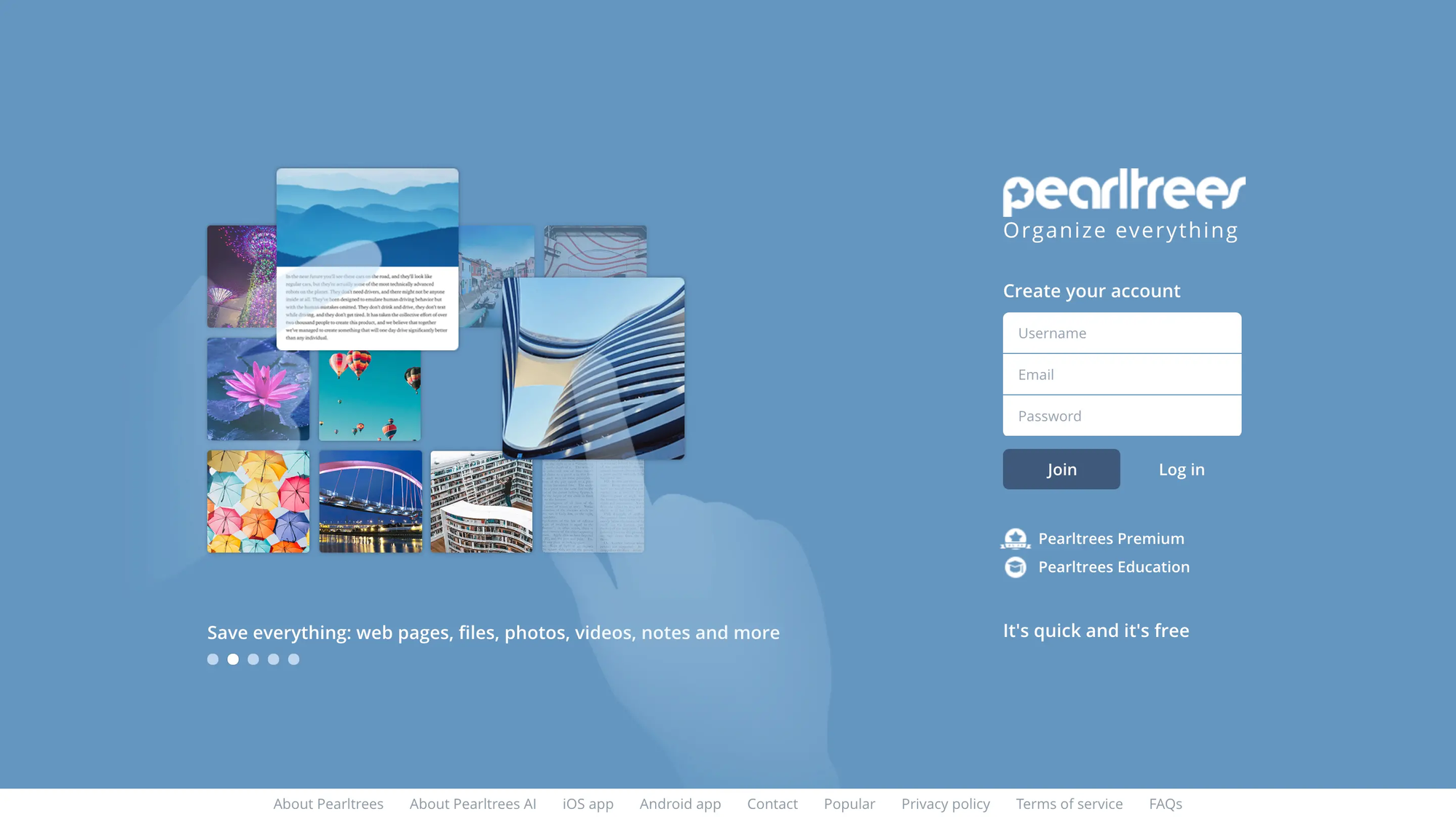 Pearltrees — альтернативна платформа для організації візуального контенту. Сервіс дозволяє зберігати зображення, посилання, документи та нотатки у вигляді «перлин», які можна групувати за категоріями. Є інструменти для спільної роботи та функції візуального картографування, які роблять його максимально зручним для комерційних та навчальних проєктів.