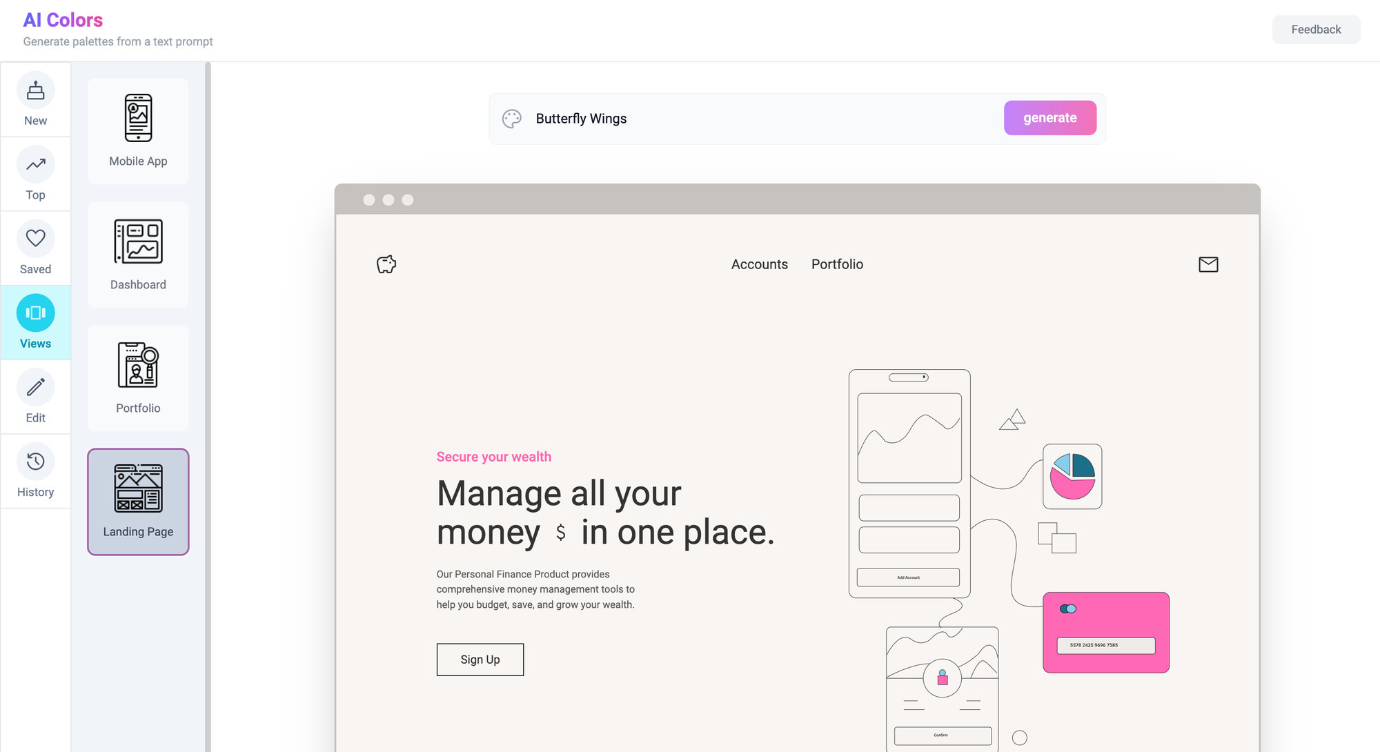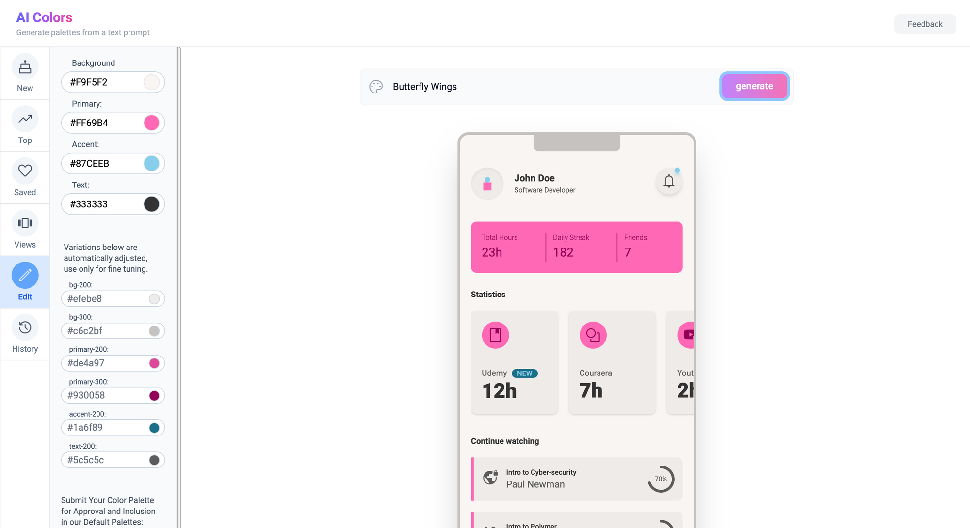 - Генерація кольорів за допомогою штучного інтелекту: AI Color використовує ШІ модель OpenAI GPT-3.5 для генерації колірних палітр на основі текстових підказок. Просто введіть запит, а інструмент автоматично створить палітри та комбінації кольорів, що відповідають UI та контексту.