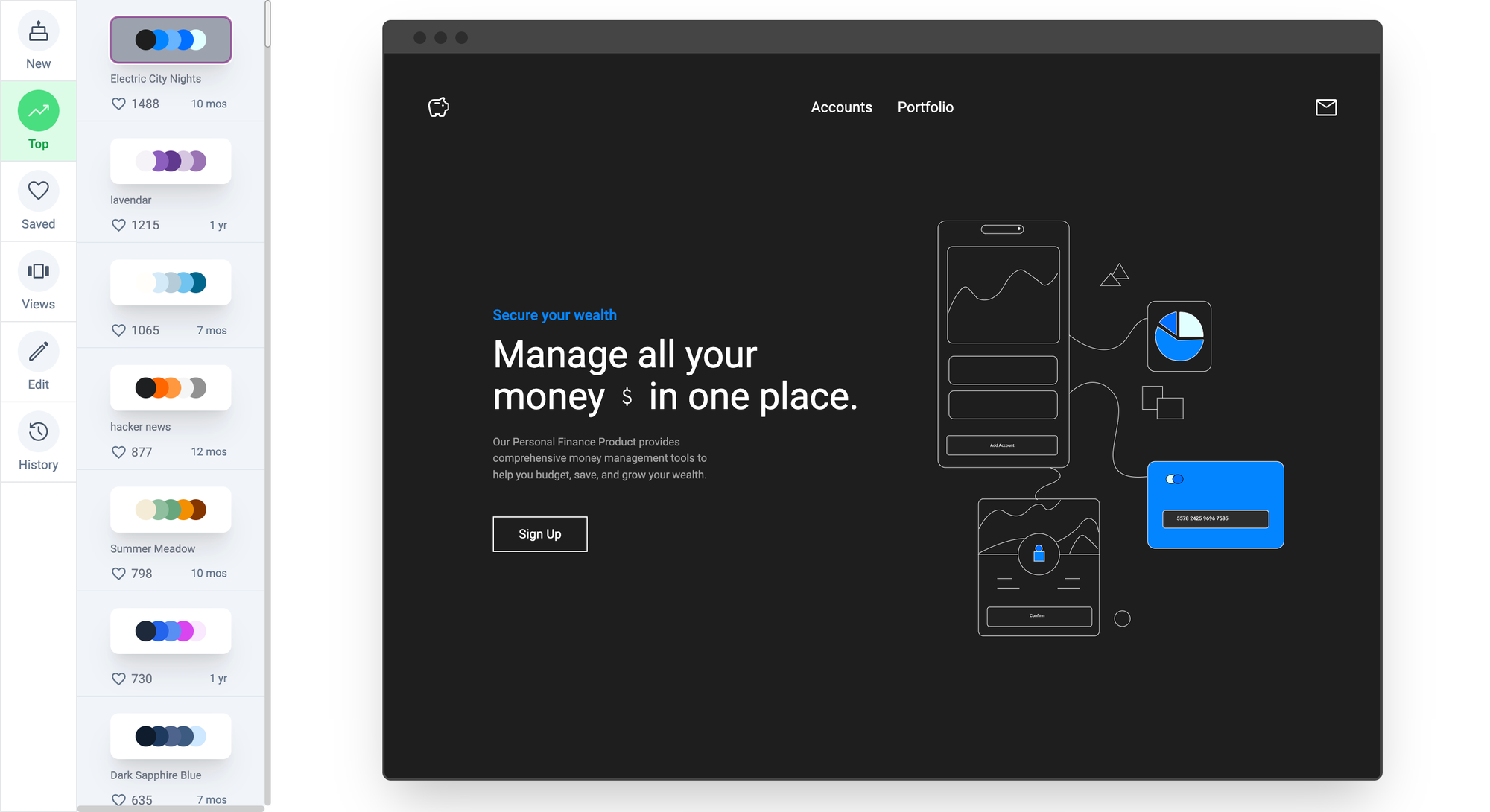 У розділі “Saved” переглядайте збережені палітри”. У “Top” та “New” містяться нові та популярні палітри, створені іншими дизайнерами. Так само редагуйте та адаптовуйте їх до свого кейсу. У розділі “History” користувачі можуть побачити свою історію застосувань та відновити будь-яку з них.