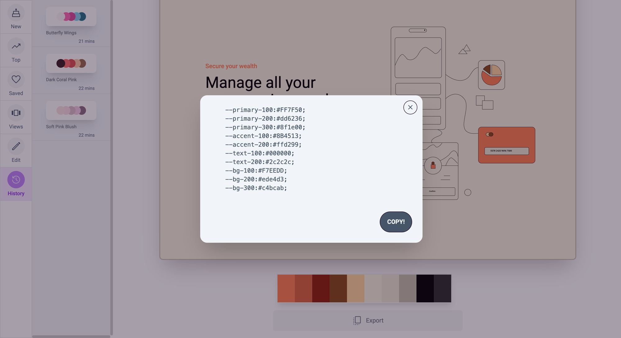 Щоб експортувати палітру, натисніть кнопку “Export” під макетом та скопіюйте дані вашої колірної комбінації.