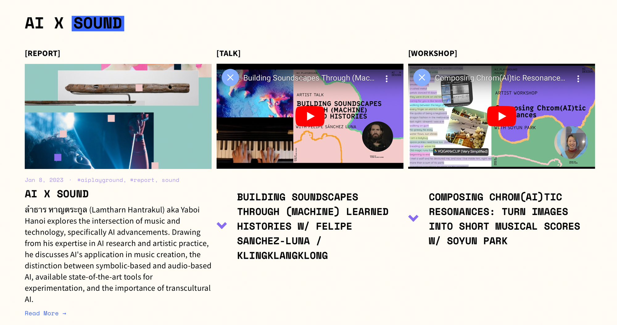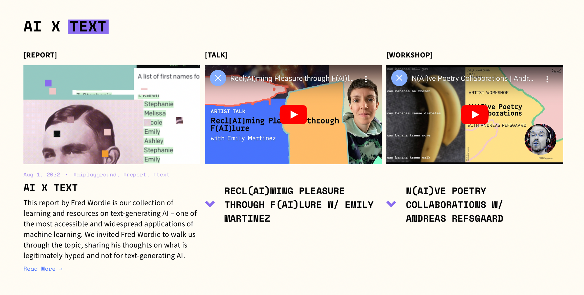 AI Playground — програма охоплює різні аспекти ШІ та його застосування в різних сферах мистецтва. Він заглиблюється в області штучного інтелекту та рухомих зображень, досліджуючи, як штучний інтелект можна використовувати для покращення візуального досвіду та створення динамічних і привабливих рухомих зображень. Завдяки практичним семінарам учасники мають можливість поекспериментувати з інструментами та техніками штучного інтелекту в контексті створення та маніпулювання рухомими зображеннями. Окрім того, AI Playground вивчає взаємодію між ШІ та текстом, ШІ й тілом, роботу ШІ й звуку.