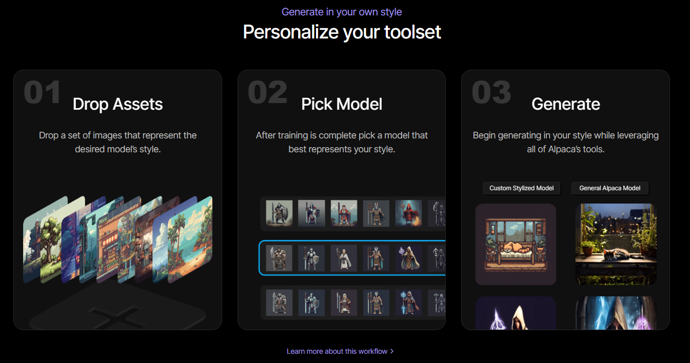 - Кастомні моделі: Alpaca дає можливість створювати індивідуальні моделі, які навчатимуться на основі специфікацій та стилю ваших зображень.