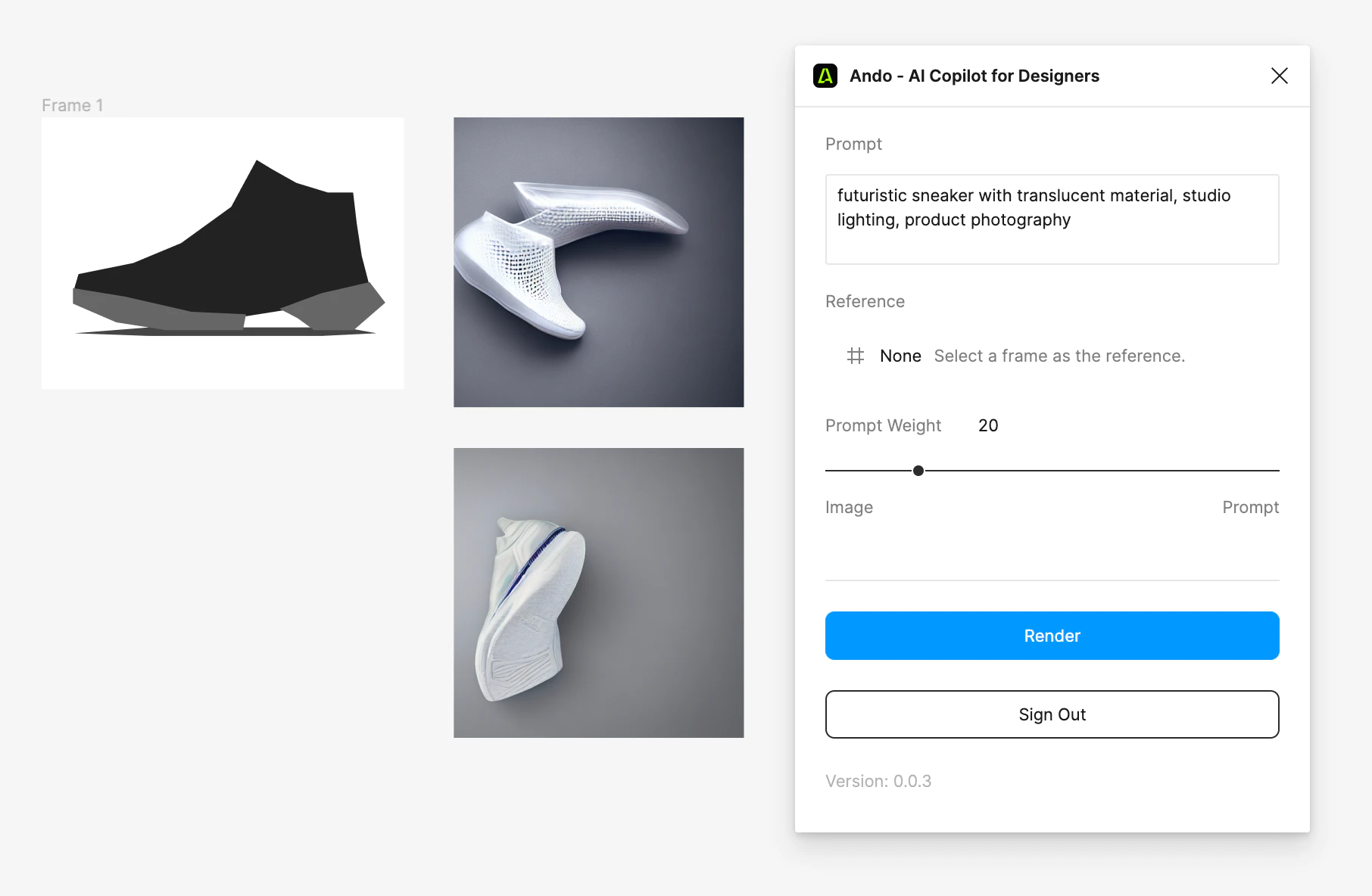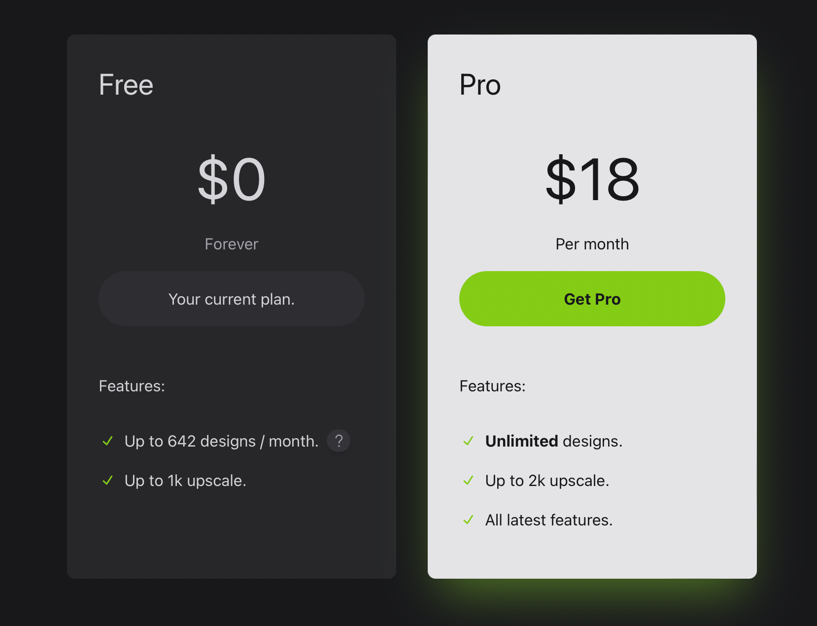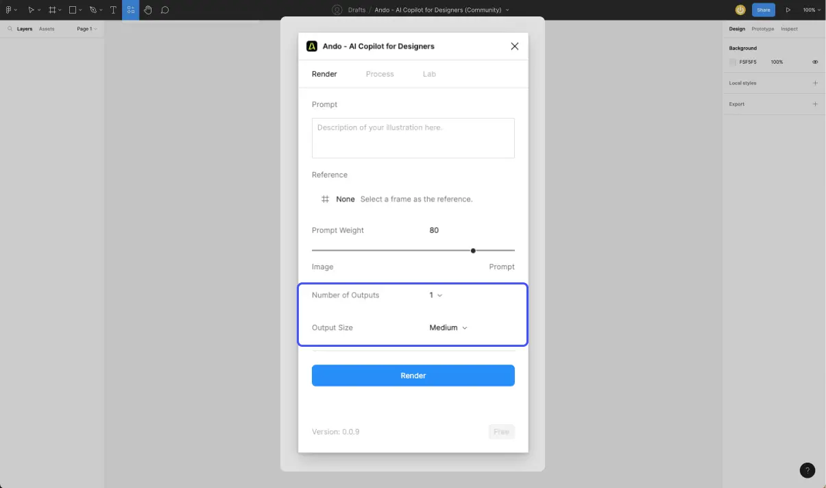 Ando має 2 тарифні плани: Free і Pro. Безкоштовний план дозволяє генерувати до 642 дизайнів на місяць, якістю до 1k. Pro план, вартістю $18 на місяць включає безлімітні генерації дизайнів у високій якості та роздільній здатності, а також доступ до всіх оновлених функцій плагіну.