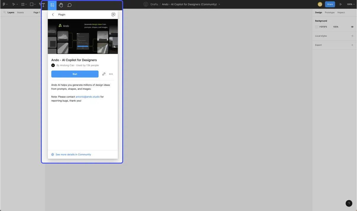 Відкрийте файл необхідний Figma Перейдіть до плагінів з панелі інструментів Введіть назву плагіну «Ando» на панелі пошуку плагіну.