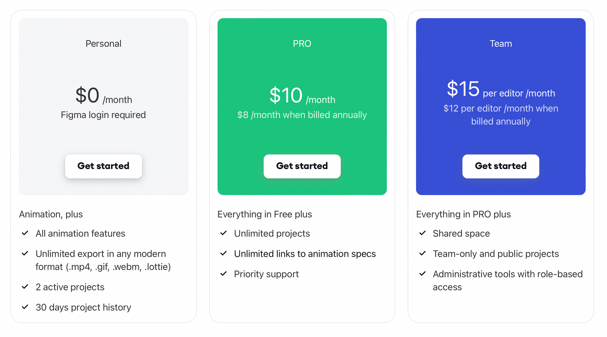 Aninix має три тарифні плани: Personal, Pro, Team. Персональний план – безкоштовний та дозволяє створювати всі типи анімації у зручних форматах з обмеженням до 2 проєктів. План Pro, своєю чергою, дозволяє створити необмежену кількість проєктів, так само надає всі анімації, а також додавати посилання до специфікацій. Вартість плану $10 на місяць. План Team – командний план зі всіма функціями співпраці. Користувачам надається спільний простір з можливістю редагування та можливістю додати колег за посиланням. Вартість тарифу складає $15 на місяць.