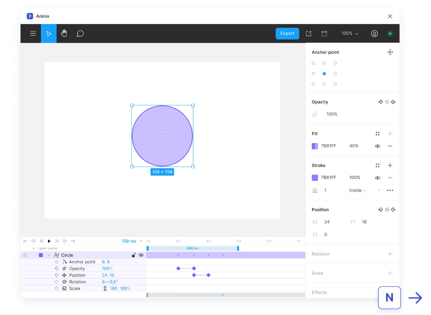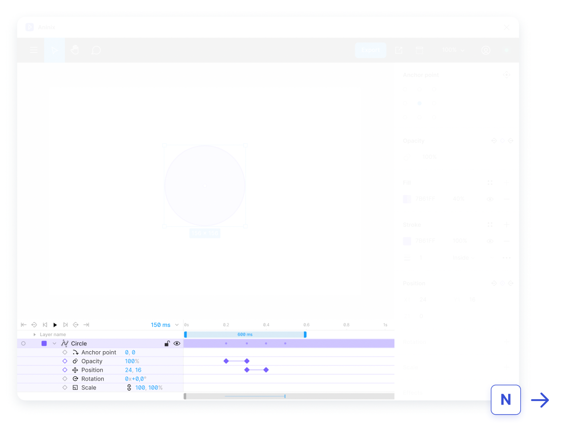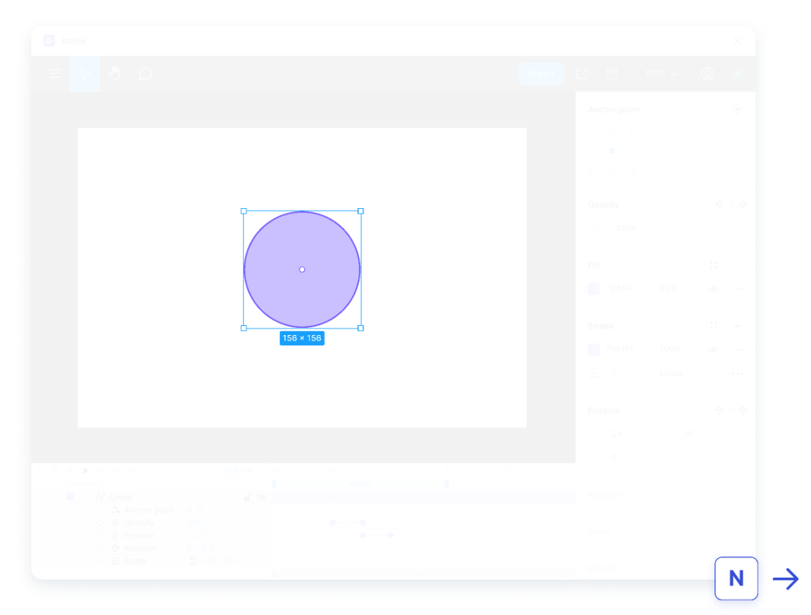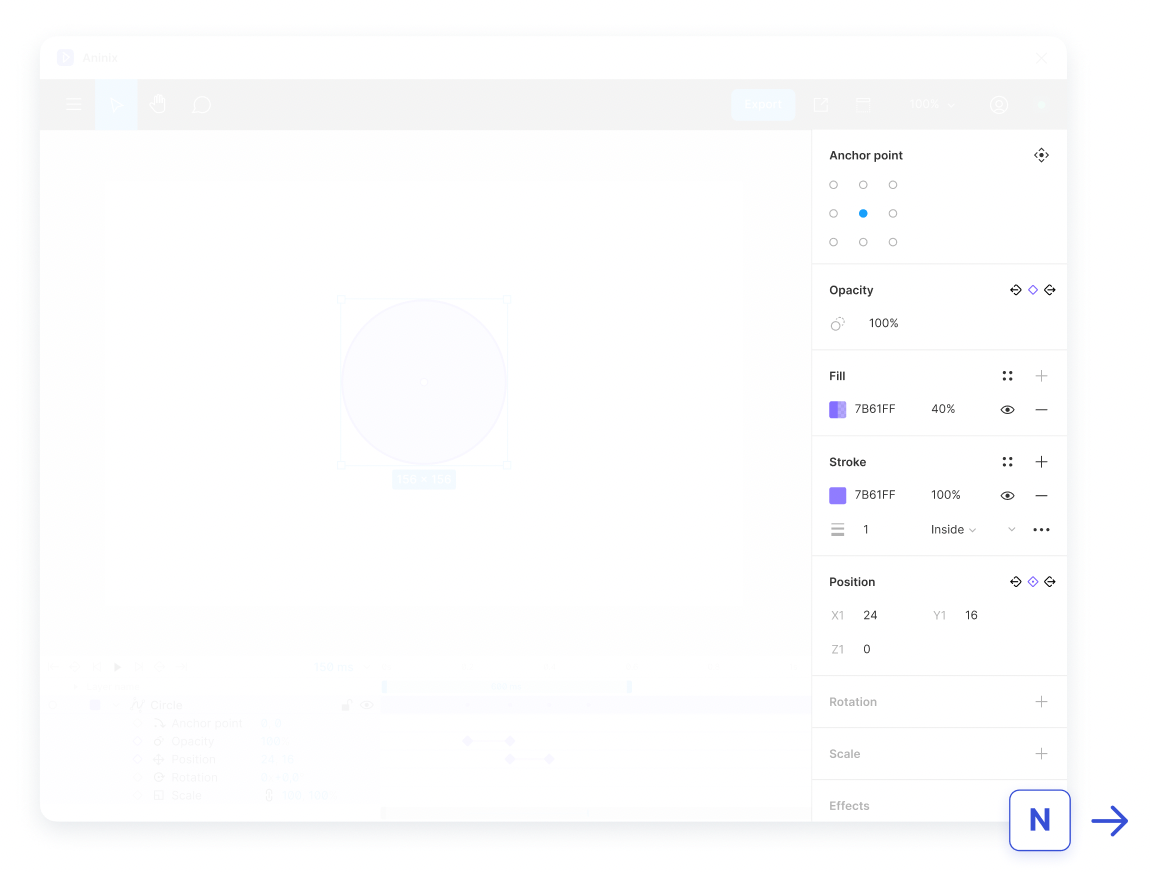 - Панель властивостей (Properties Panel): схожа на панель, яку ви бачите в Figma, але Aninix додає ще кілька додаткових функцій для спрощення роботи з анімацією.