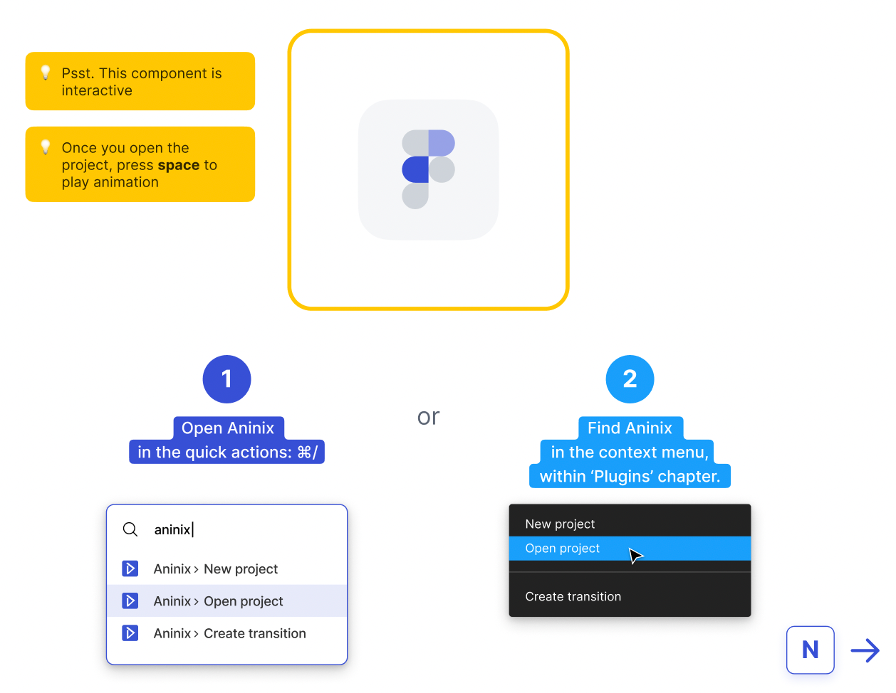 Знайдіть Aninix у контекстному меню Figma, в розділі "Плагіни". Введіть назву та запустіть, натиснувши “Run”. Для створення проєкту виберіть кадр (фрейм) і запустіть плагін або натисніть Ctrl (або Cmd на Mac) + /. Створіть новий проєкт > "New project".