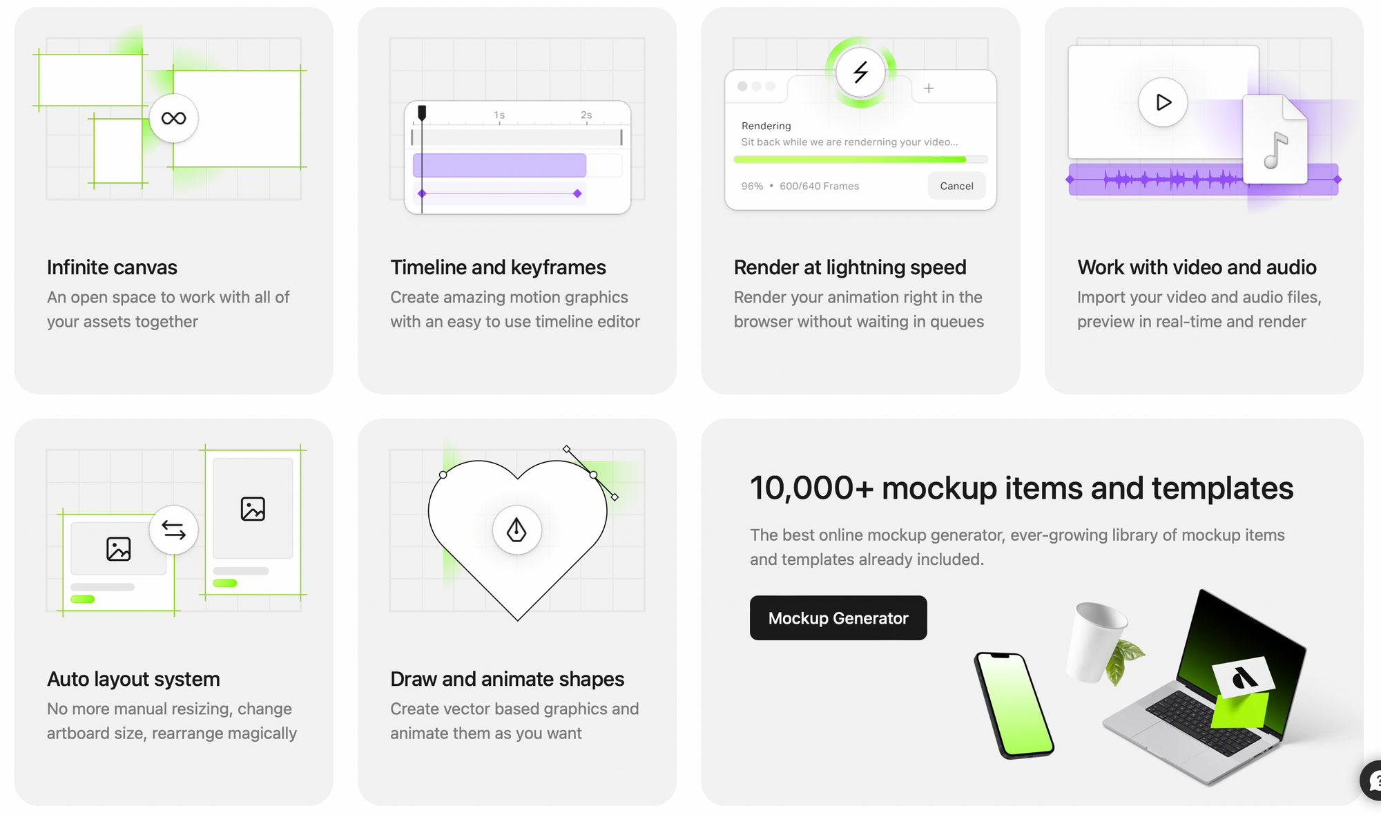 - Багато шаблонів та компонентів, що дозволяють швидко створювати графіку та анімацію