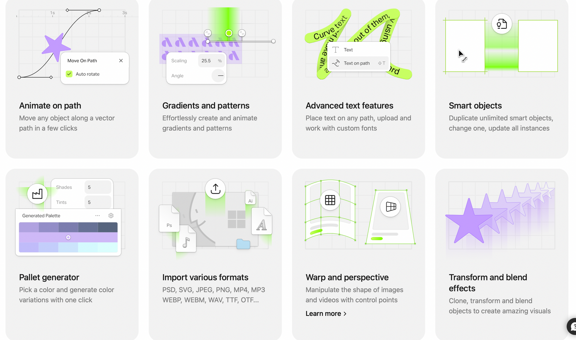 Для створення анімації в Artboard.studio користувачі можуть використовувати засоби, такі як ефекти переходу, анімація появи, зникнення та інші. Крім того, Artboard.studio має бібліотеку ефектів, що дозволяє користувачам легко додавати анімацію до своїх зображень, що робить процес створення анімації набагато простішим, ніж у просунутих програмах.