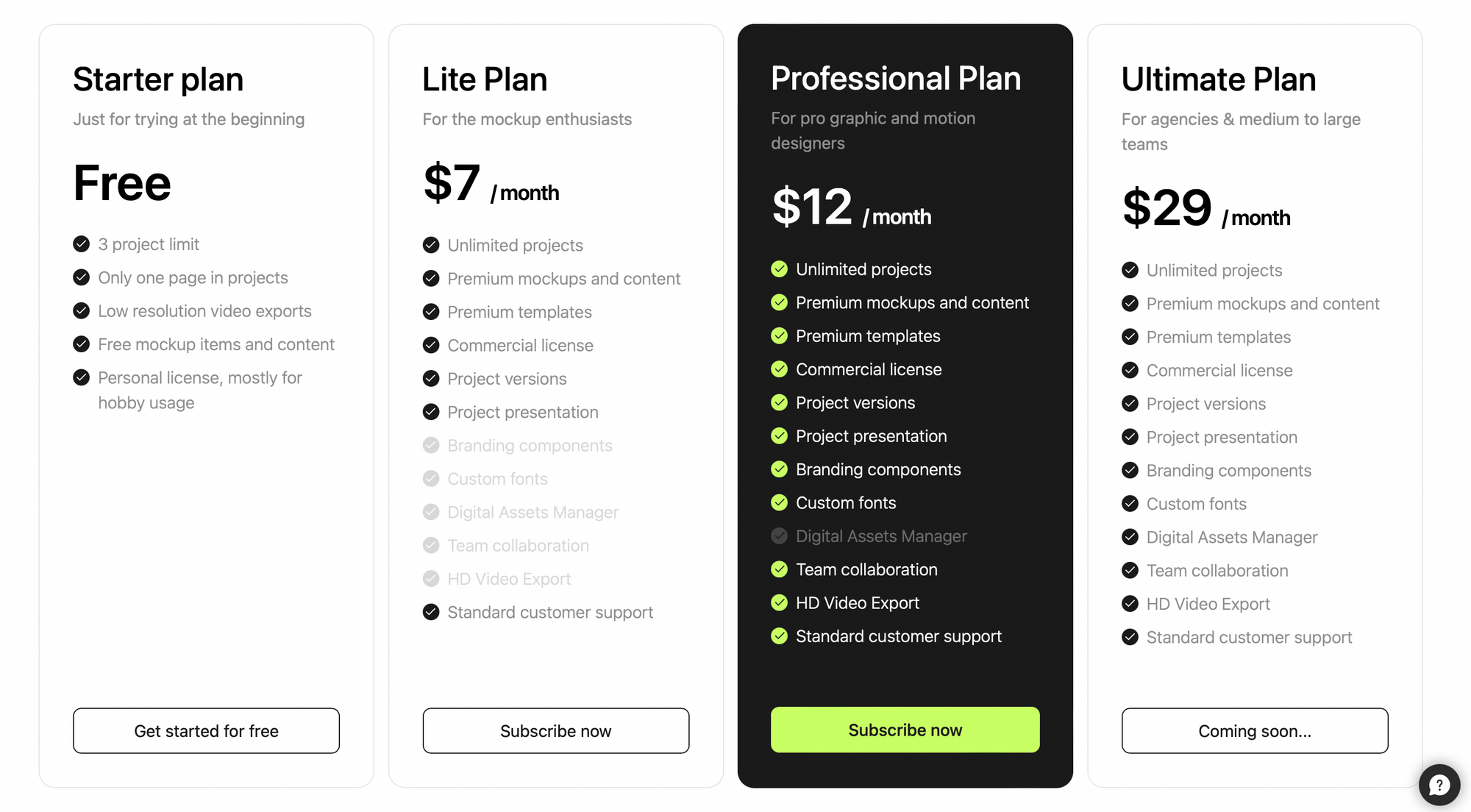 Вартість кожного з тарифних планів залежить від того, наскільки багато можливостей та ресурсів вони мають. Безкоштовний тарифний план, як правило, призначений для особистого використання та маленьких проєктів, тоді як Pro, Team та Agency тарифні плани можуть бути більш відповідними для команд та бізнесів, які працюють над більш складними проєктами.
