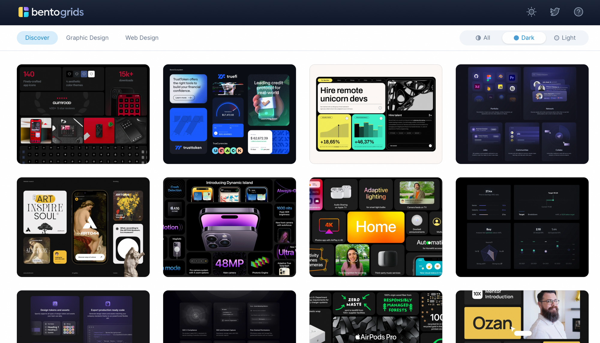 Отже, Bento Grids — колекція макетів на основі плиток, розроблена для забезпечення процесу створення адаптивних інтерфейсів. Вона надає набір простих і гнучких сіток, які дозволяють розробникам легко керувати розміщенням елементів на сторінці та адаптувати їх до різних розмірів екрана. Також сітки можна відфільтрувати за темами: світлою та темною, а також за напрямом, графічний та вебдизайн.
