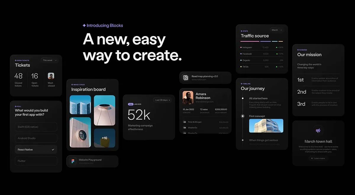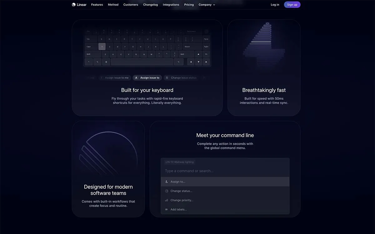 Подібним чином дизайнери з Linear використали бенто дизайн, щоб представити функцію у гладкому темному стилі. Круто, що його, можна налаштувати так, щоб текстовий вміст знаходився вгорі або під зображенням.