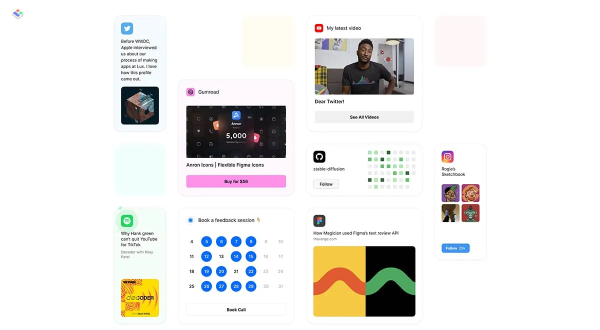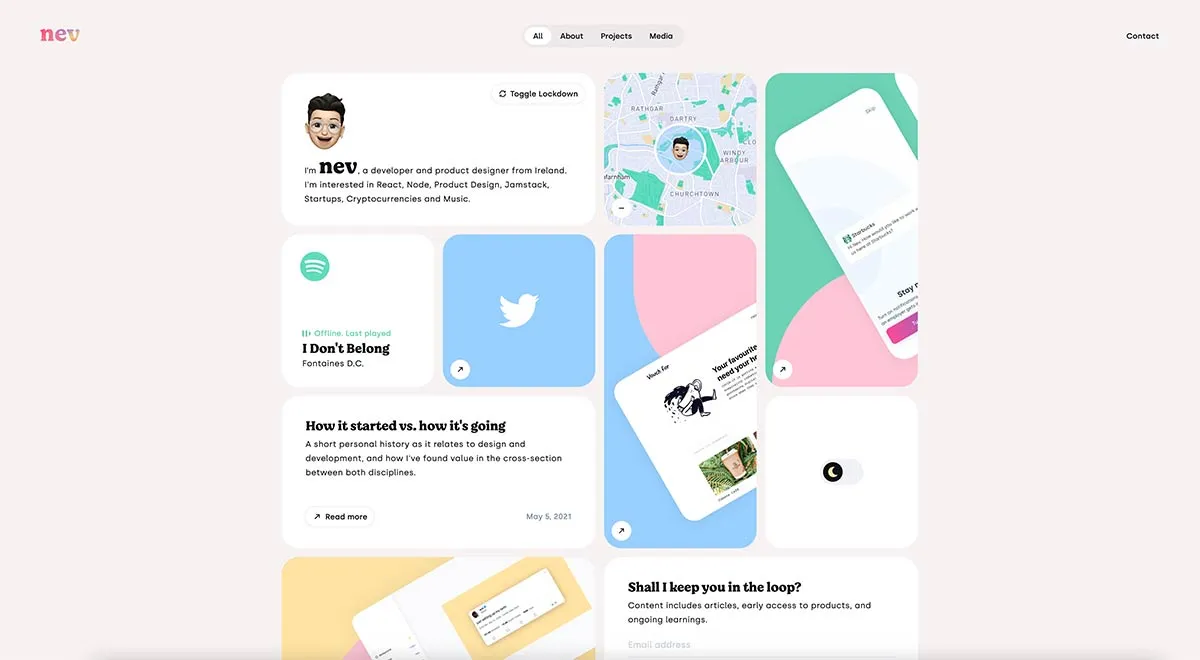 Bento — один з останніх найпопулярніших сайтів у стилі «Linktree», на якому кожен може створити особисту сторінку. Як випливає з назви, вони використовували сітку для формування блоків вмісту, які сформували дизайн самого інтерфейсу користувача. Ви можете експериментувати, формуючи блоки з різними розмірами та акцентами.
