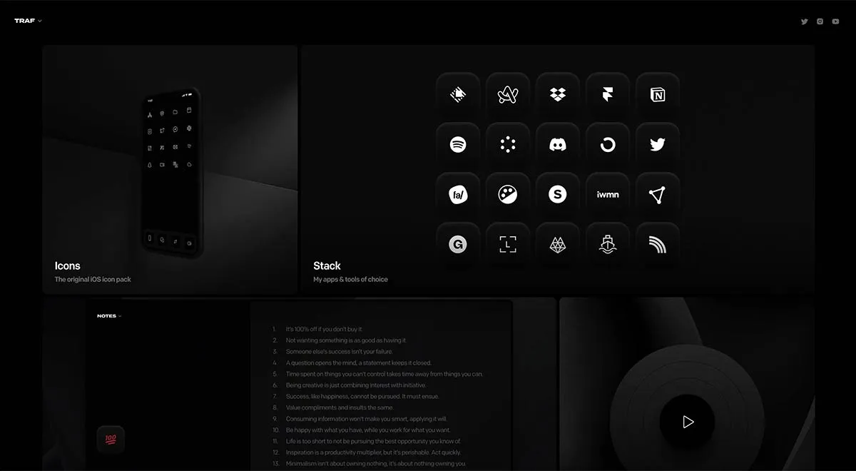 Один із найулюбленіших сайтів портфоліо, Traf використовує бенто бокс, щоб розмістити свої роботи в портфоліо, підкреслюючи елегантним темним дизайном. Натиснувши на кожну роботу, ви побачите більше дизайнів, натхненних сіткою.
