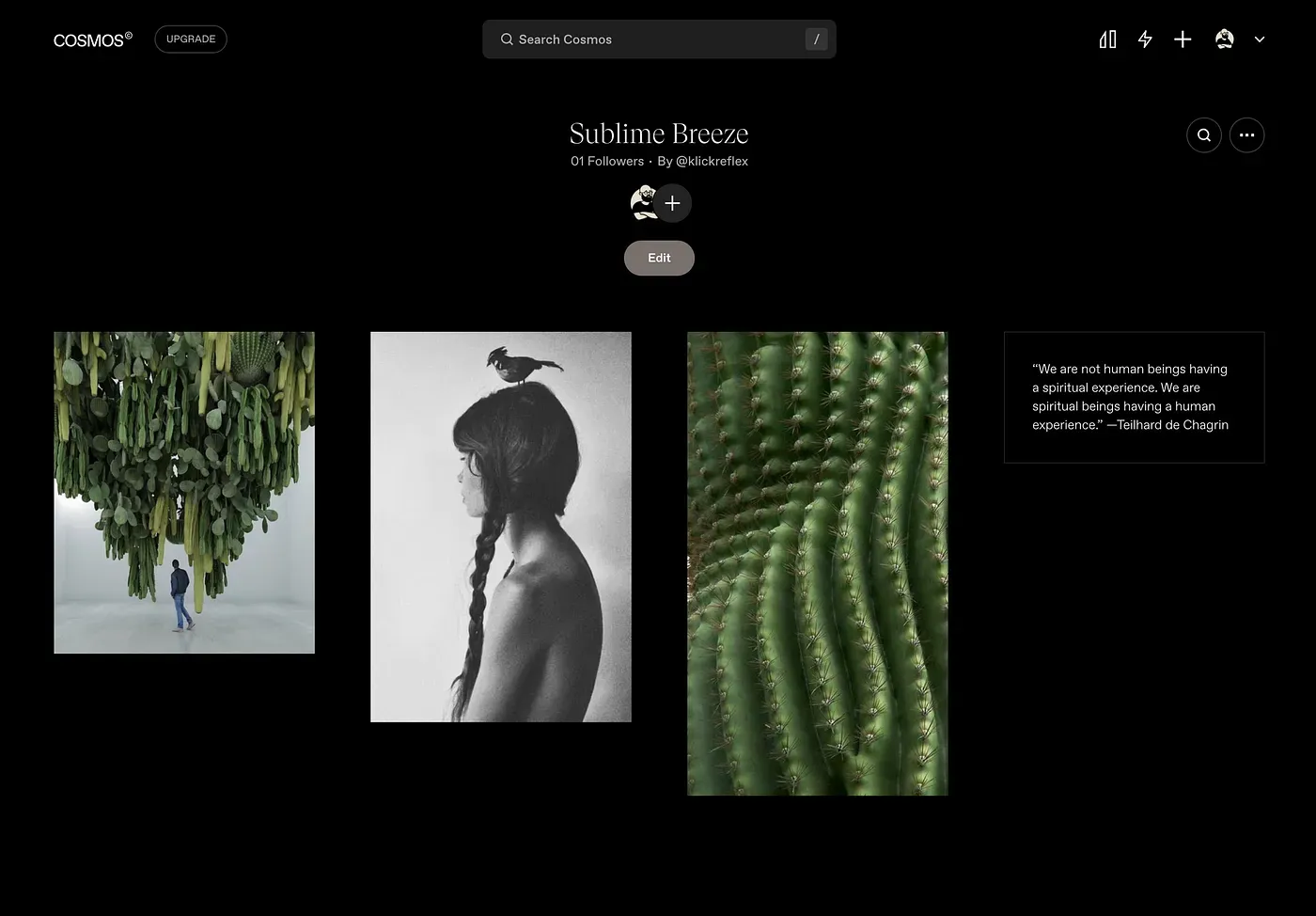 - Спільнота і стеження: Cosmos не тільки дозволяє зберігати вміст, але і створює активну спільноту творчих людей. Ви можете стежити за кластерами інших користувачів, спілкуватися з ними, ділитися своїми ідеями та натхненням. Це створює можливості для взаємодії, обміну досвідом та спільної творчості.
