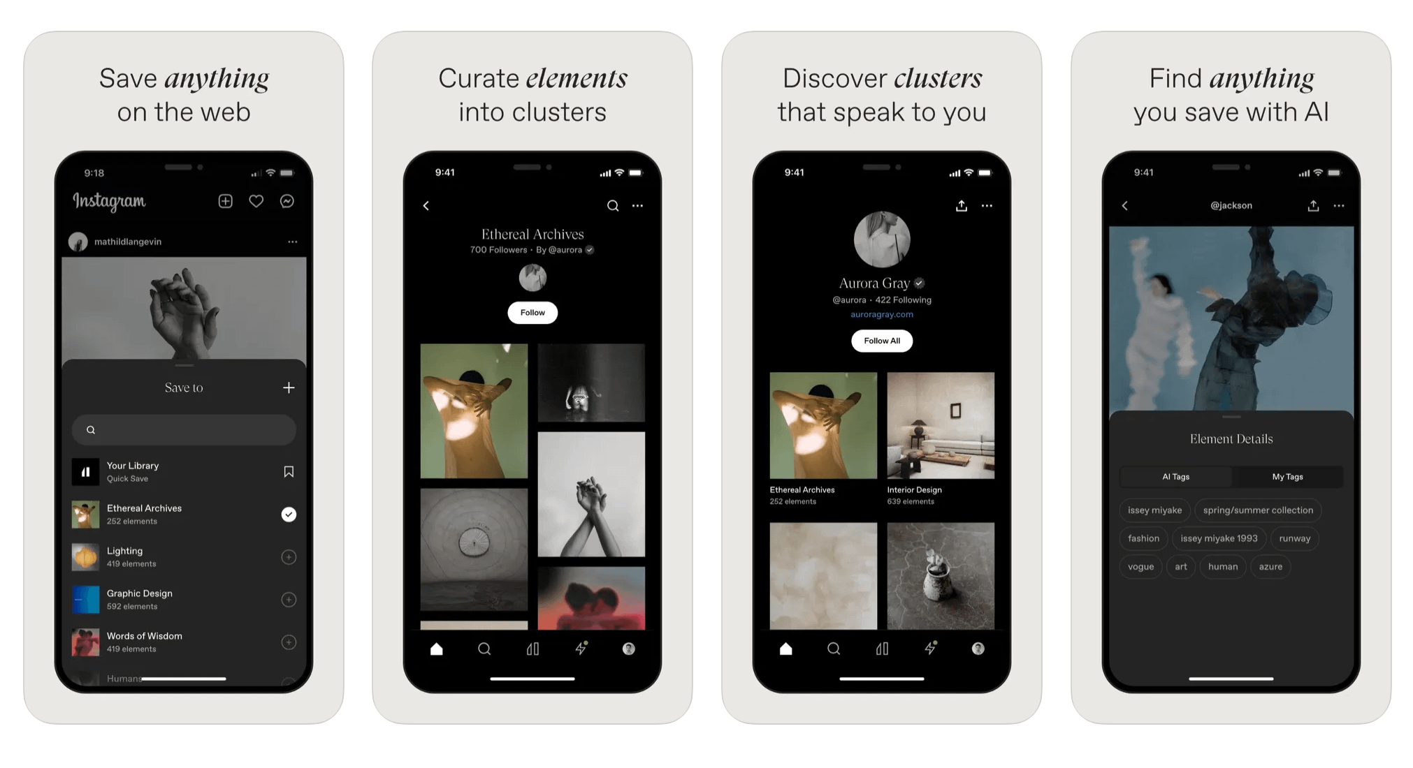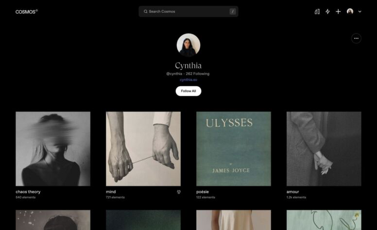 Щобільше, ви можете додавати елементи, які були збережені іншими користувачами на платформі, до власних кластерів. Або ж, якщо вам цікаві лише деякі з них, стежте за ними, не додаючи до власного акаунту. Cosmos відрізняється від Pinterest як раз таки тим, що тут ви слідкуєте не за людьми, а за вподобаними кластерами. Таким чином, Cosmos створює унікальну спільноту, яка об'єднує людей з подібними інтересами.