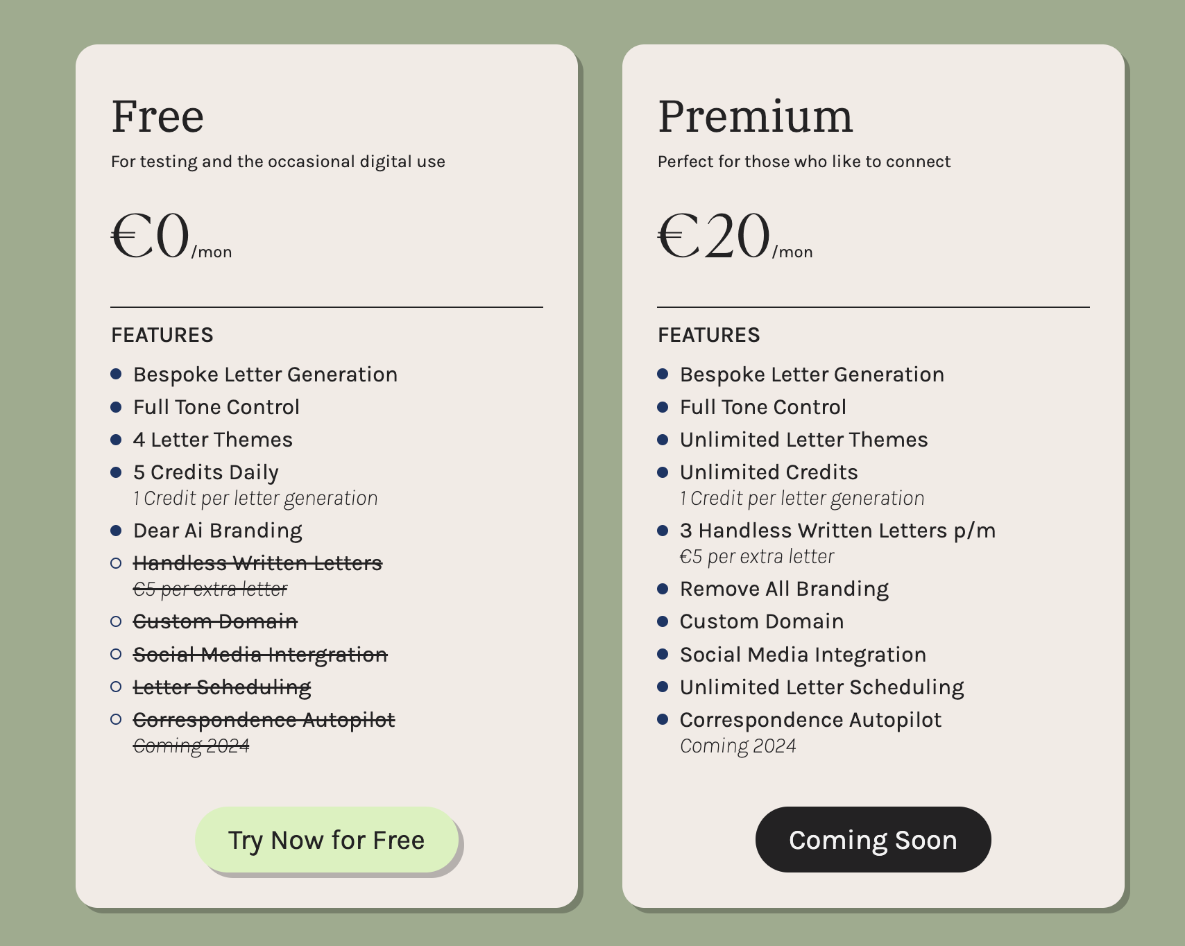 Dear AI має всього 2 тарифні плани: Free та Premium за 20 євро на місяць. Безкоштовний план надає можливість генерувати до 5 листівок на день з обмеженням 4 тем та водяними марками Dear AI. У безкоштовному плані листи написані звичайним цифровим текстом, тому вручну написані листи можна генерувати тільки у платному плані. Premium також надає доступ до всіх тем без брендингу Dear AI та інтегрується з соціальними мережами для автопілота та експорту листівок.