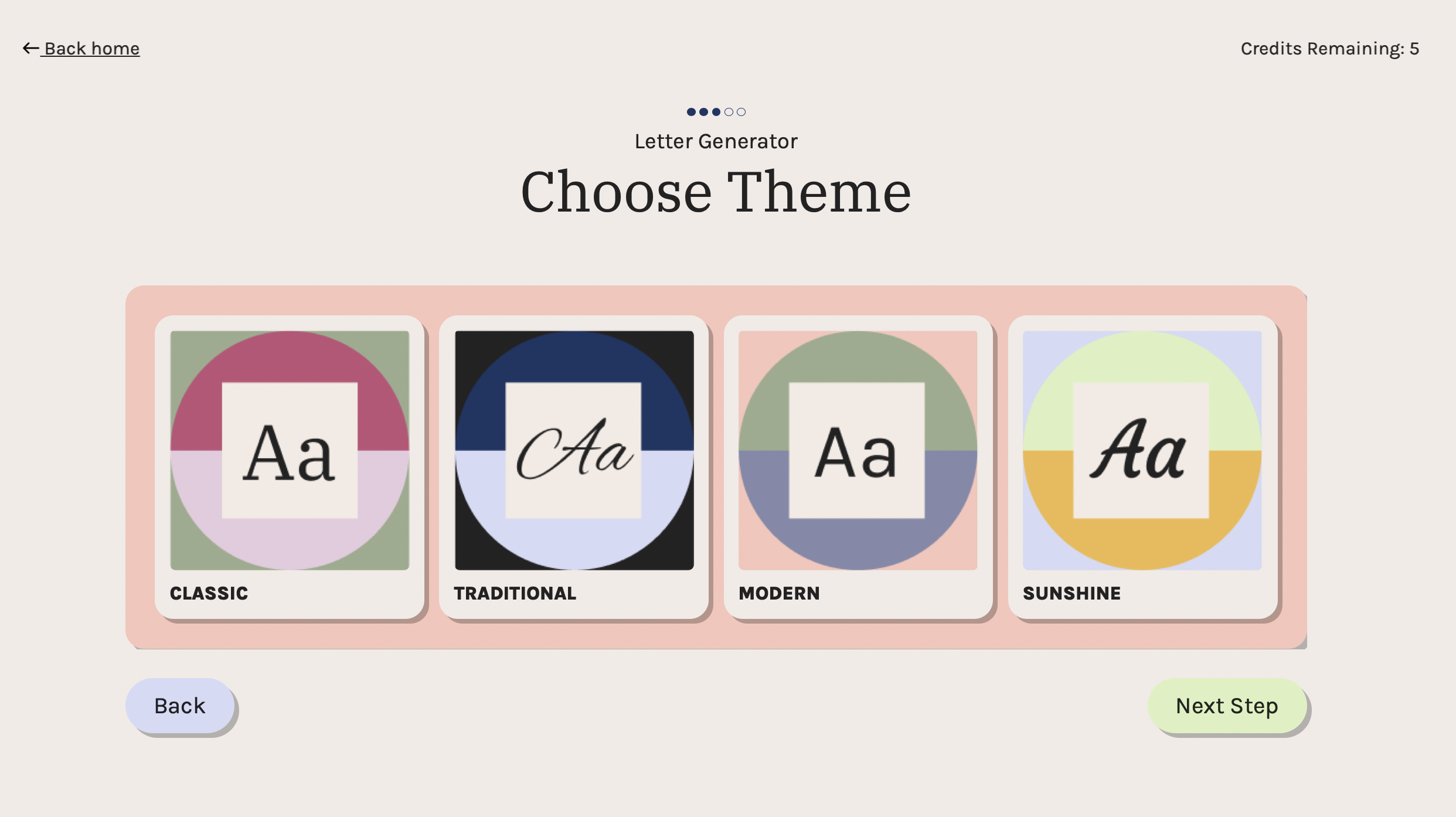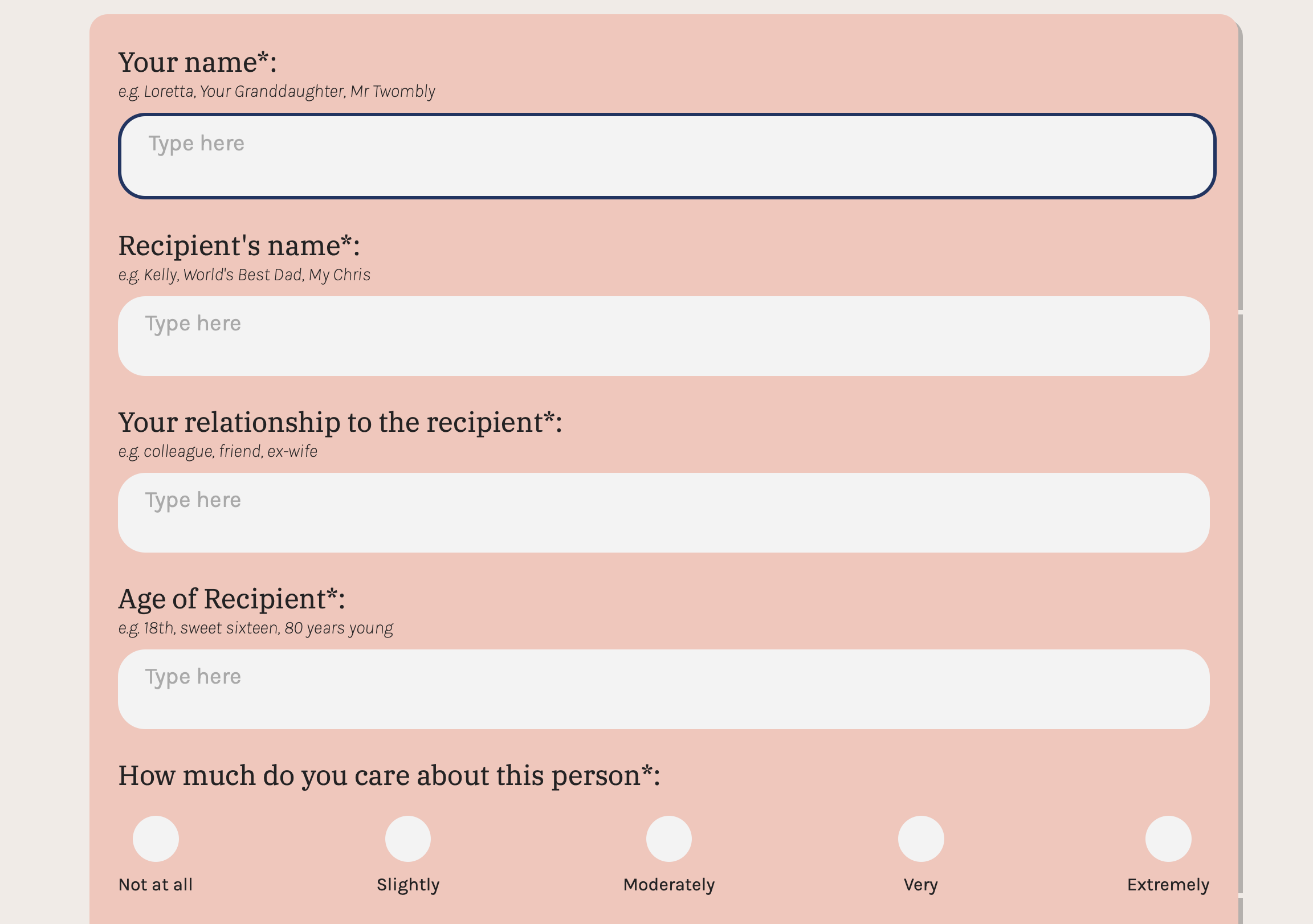 Для того, щоб згенерувати лист перейдіть на сайт та натисніть на кнопку “Try it now”. Далі виберіть тип листа, наразі їх доступно 4: лист подяки, любовний лист, лист до дня народження, співчутливий лист. Далі заповніть невелику анкету про отримувача.