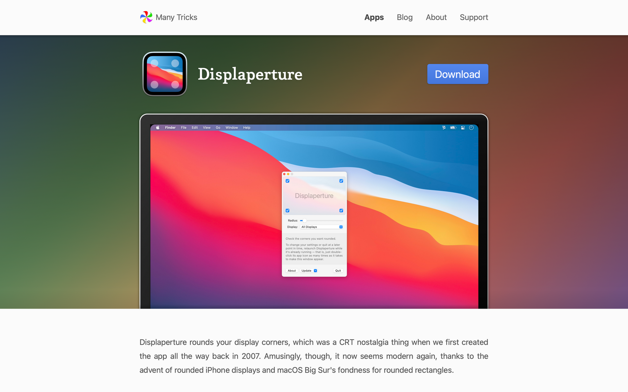 Нашел интересное бесплатно приложение для MacOS. Утилита Displaperture позволяет скруглять углы вашего дисплея. По началу мне показалась эта функция смешной, но после реального опыта использования пришел к тому, что скругленные края дисплея выглядят действительно лучше.