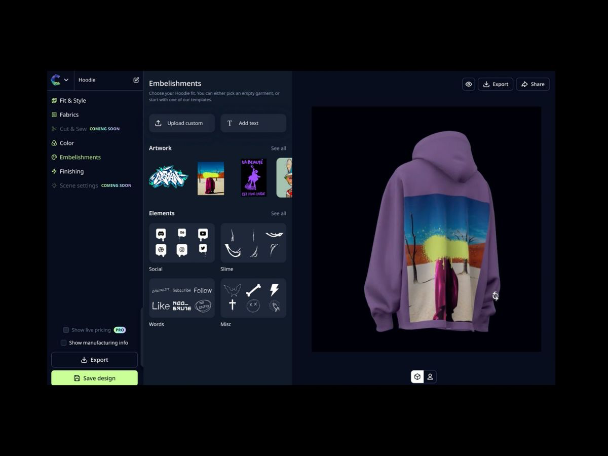 Cheyn — це AI інструмент для створення 3D-макетів одягу за допомогою якого користувачі можуть концептуалізувати та спроєктувати дизайн одягу, обравши фасон, налаштувавши кольори та принти, додавши потертості та інші особливості. Весь процес проходить, безпосередньо у браузері. Одяг відображається у 3D форматі, об’єкт можна покрутити, повернути та навіть перевернути. Наразі інструмент знаходиться на етапі бета-тестування.