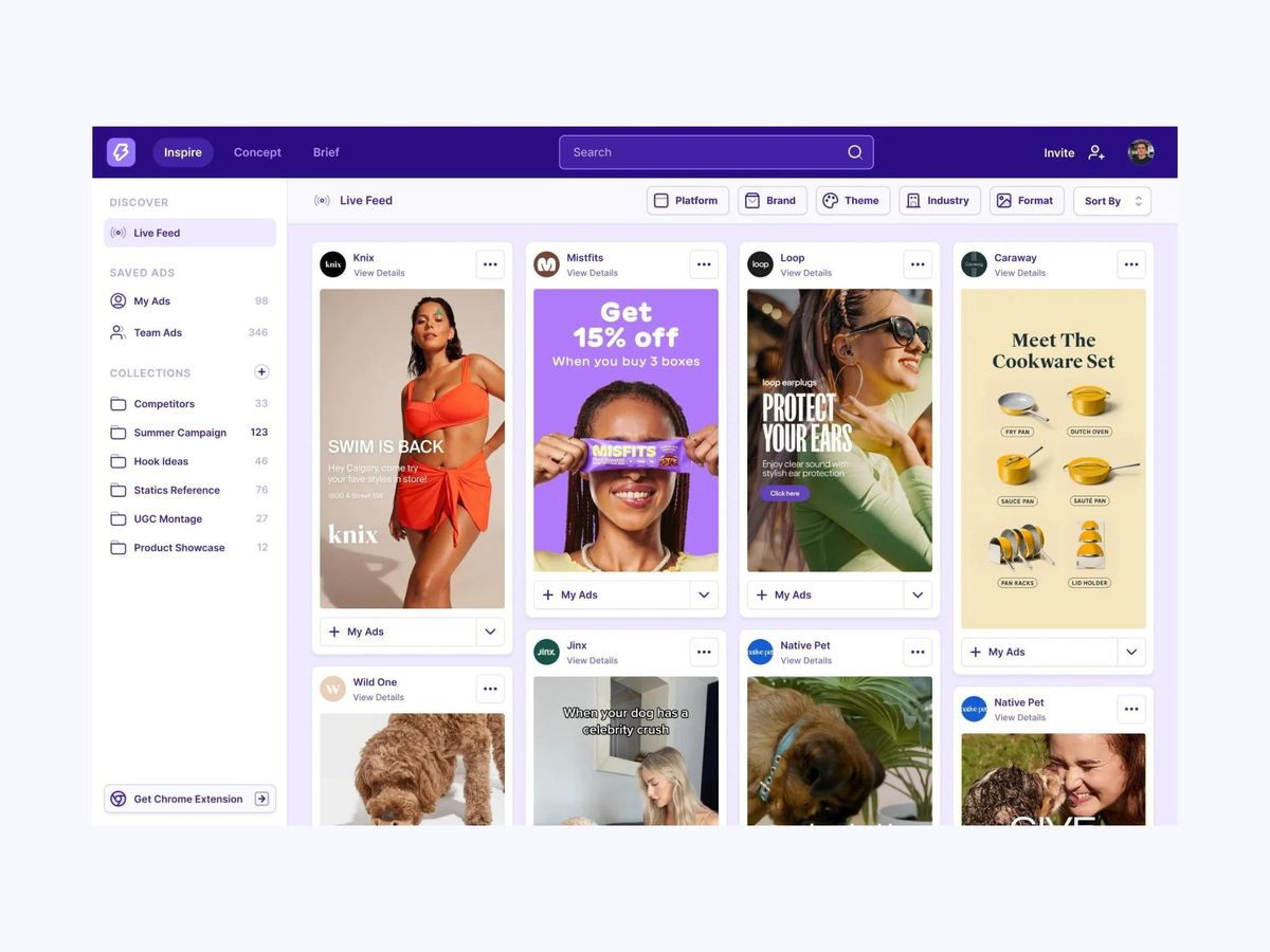 MagicBrief — це AI платформа, яка дає можливість дизайнерам та маркетологам зберігати та впорядковувати посилання на рекламу з різних платформ соціальних мереж, зокрема TikTok і Facebook Ad Library, за допомогою зручного розширення Google Chrome. Фільтруйте рекламу за категоріями та каналами. А окрім референсів макетів, збирайте рекламу ваших конкурентів та сортуйте всі матеріали по тематичним папкам.
