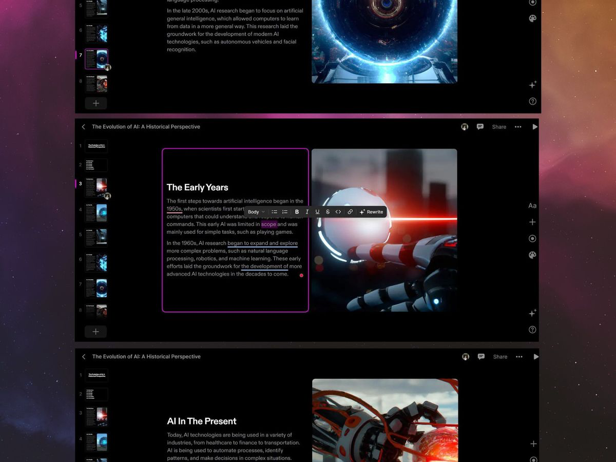 Tome — онлайн-платформа, яка використовує штучний інтелект для створення презентацій. Tome це комбінація двох механізмів: ChatGPT і DALL-E 2. За допомогою першого програма генерує тексти, а за допомогою другого малює зображення. Принцип доволі простий та типовий, користувач формує текстові підказки, які максимально точно описують запит, побажання, тематику та вміст презентації. Дотримуючись підказок, Tome створює близько восьми слайдів із відповідними зображеннями та текстами.