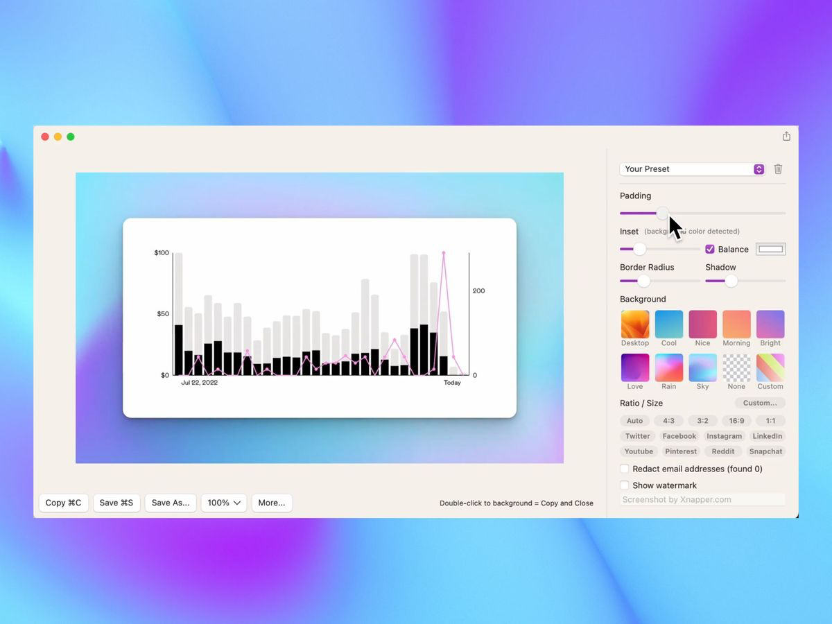 Xnapper — це онлайн-інструмент для створення красивих скриншотів. Програма дозволяє користувачам зберігати, сортувати та групувати зображення на одній робочій області, окремому файловому сервері. Окрім базової функції знімання екрана, інструмент може змінювати фон скриншоту, робити знімки екрана з прозорим фоном, а також прикрашати готові знімки різноманітними візуальними елементами, додавати та видаляти об’єкти тощо.