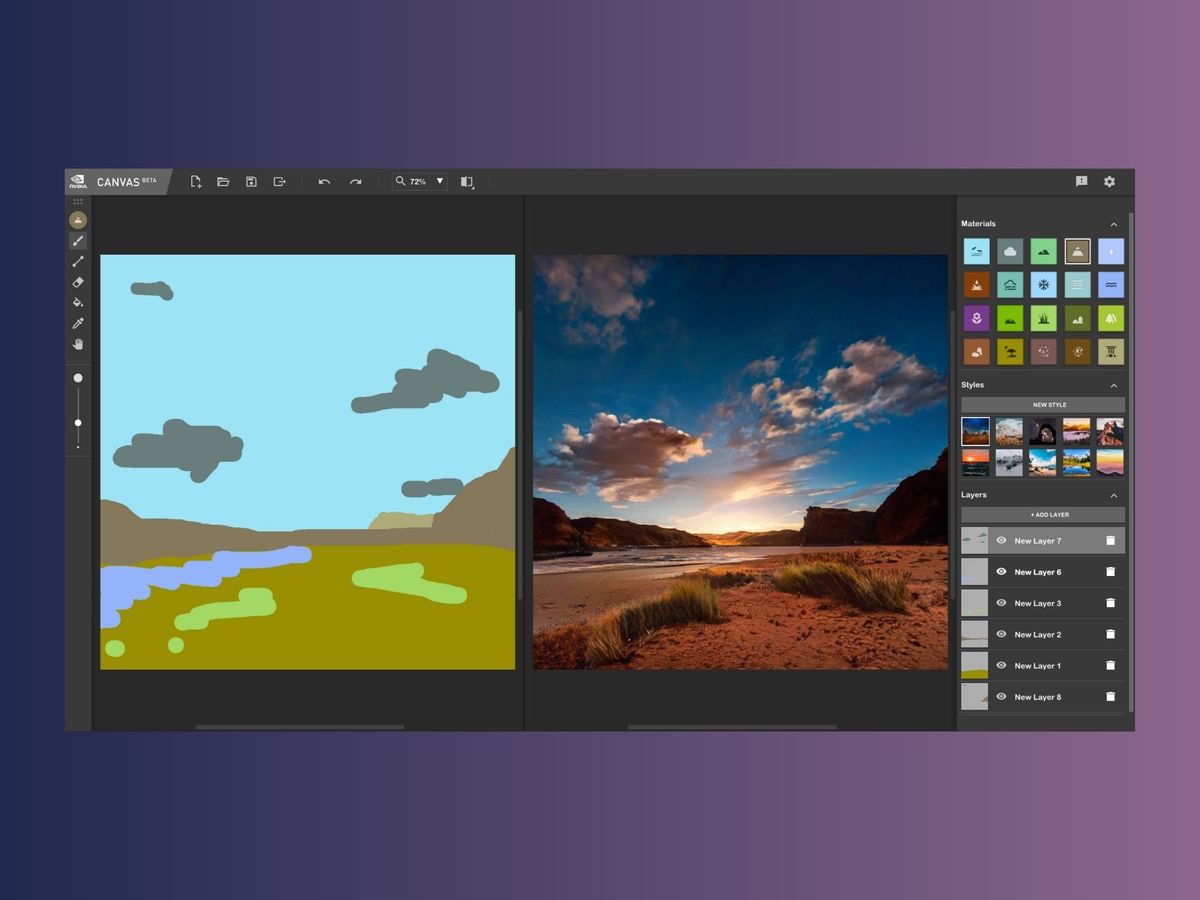 Nvidia Canvas — програмне забезпечення на основі штучного інтелекту, розроблене компанією Nvidia, для перетворення намальованих від руки ескізів у надзвичайно реалістичні пейзажні фотографії. Щоб використовувати Nvidia, вам потрібно встановити бета-версію з Nvidia Studio та мати відеокарту серії RTX разом з останніми драйверами.