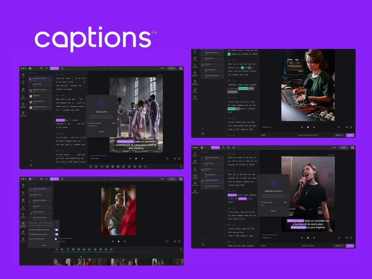 Captions — це багатофункціональний алгоритмічний інструмент, ретельно розроблений для створення та редагування аудіо- та відеовмісту на ПК та мобільних пристроях. Платформа надає безліч потужних функцій, здатних революціонізувати та покращити мультимедійні проєкти: генерувати голос по шматочку його запису, прибирати слова-паразити, покращувати попадання міміки рота в текст, додавати субтитри, видаляти фон на відео та багато іншого.