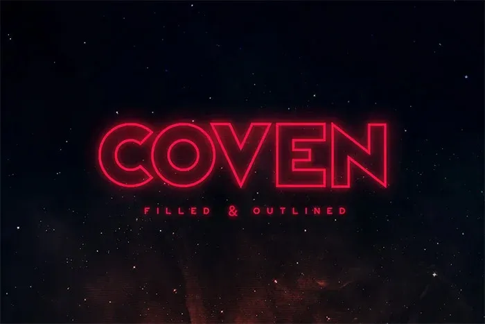 Coven – це повністю великий шрифт, представлений у заповненому та контурному варіантах. Важка вага та гострі кути надають Coven особливого вигляду. Шрифт містить цифри, розділові знаки та багатомовні символи. Є шрифт вебверсії.