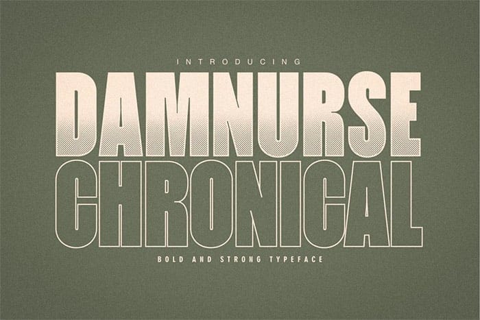 Damnurse Chronical – це товстий жирний шрифт, який буває у звичайному та контурному варіантах. Набір за посиланням включає великі та малі літери, цифри, багатомовну підтримку та вебшрифт. Damnurse Chronical - відмінний вибір для заголовків, обкладинок журналів, плакатів, одягу, товарів та багато іншого.