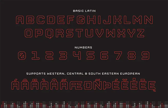 Neon Outline Font включає п'ять окремих шрифтів. Їх можна використовувати окремо або у комбінації. Очевидно, що ці шрифти були створені з урахуванням неонового дизайну, але не обмежені. Цей напівжирний шрифт без засічок відмінно підходить для заголовків, реклами, зображень у соціальних мережах та багато іншого. Є цифри та альтернативні символи. Доступна вебверсія шрифту.
