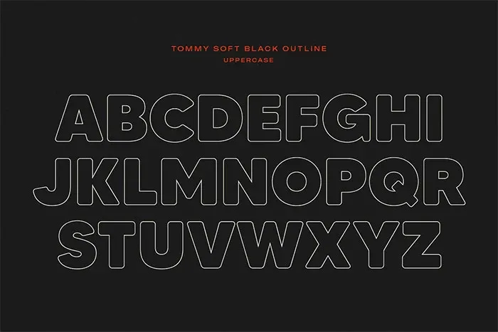 Tommy Soft – це універсальна гарнітура, яка включає 14 шрифтів. Існує сім різних ваг шрифту зі звичайними та контурними версіями для кожного. Всі ці варіанти та можливі комбінації відкривають широкі можливості. Є великі та малі літери, цифри, пунктуація та підтримка кількох мов. Доступний вебшрифт.