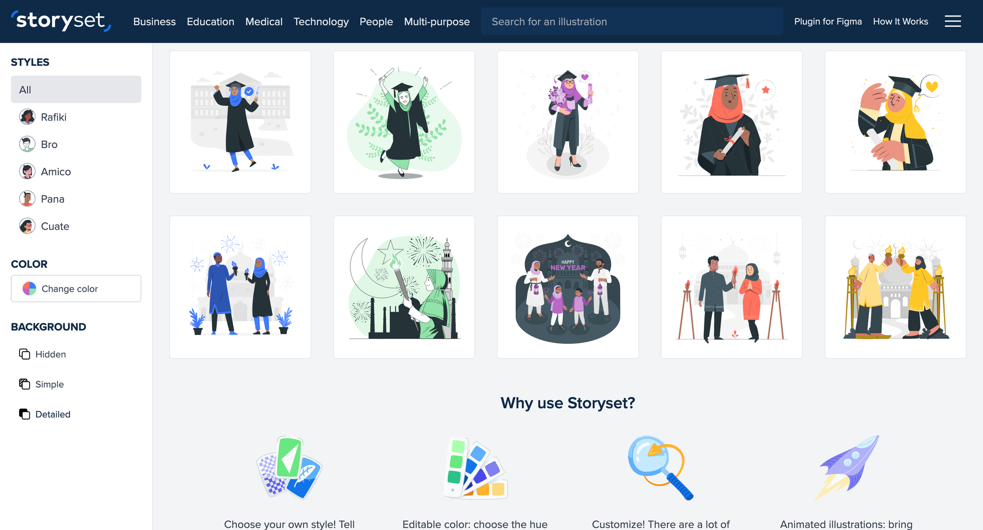 - Вибір стилю: ілюстрації доступні в кількох унікальних стилях, таких як Rafiki, Amico, Bro та інші, що відповідають різним завданням та естетичним вподобанням.