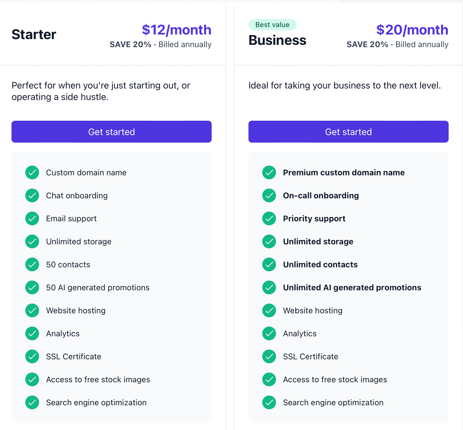 Durable має всього 2 тарифні плани: Starter і Business. Перший чудово підходить для фрилансерів та окремих спеціалістів та коштуватиме всього 12 доларів на місяць, тим часом другий більше підходить для команд та компаній й відповідно коштуватиме дорожче, 20 доларів на місяць, що виходить досить економічно вигідно. В чому ж різниця між Starter і Business?
