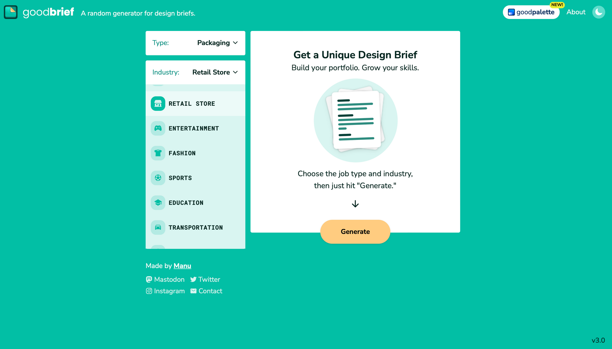 Goodbrief — інструмент для генерації дизайнерських брифів для різноманітних типів проєктів та ніш, допомагаючи користувачам вдосконалювати свої навички, експериментувати зі стилями та розвиватися у сфері дизайну. Програма також підходить для спеціалістів-початківців, які хочуть напрацювати своє перше портфоліо.