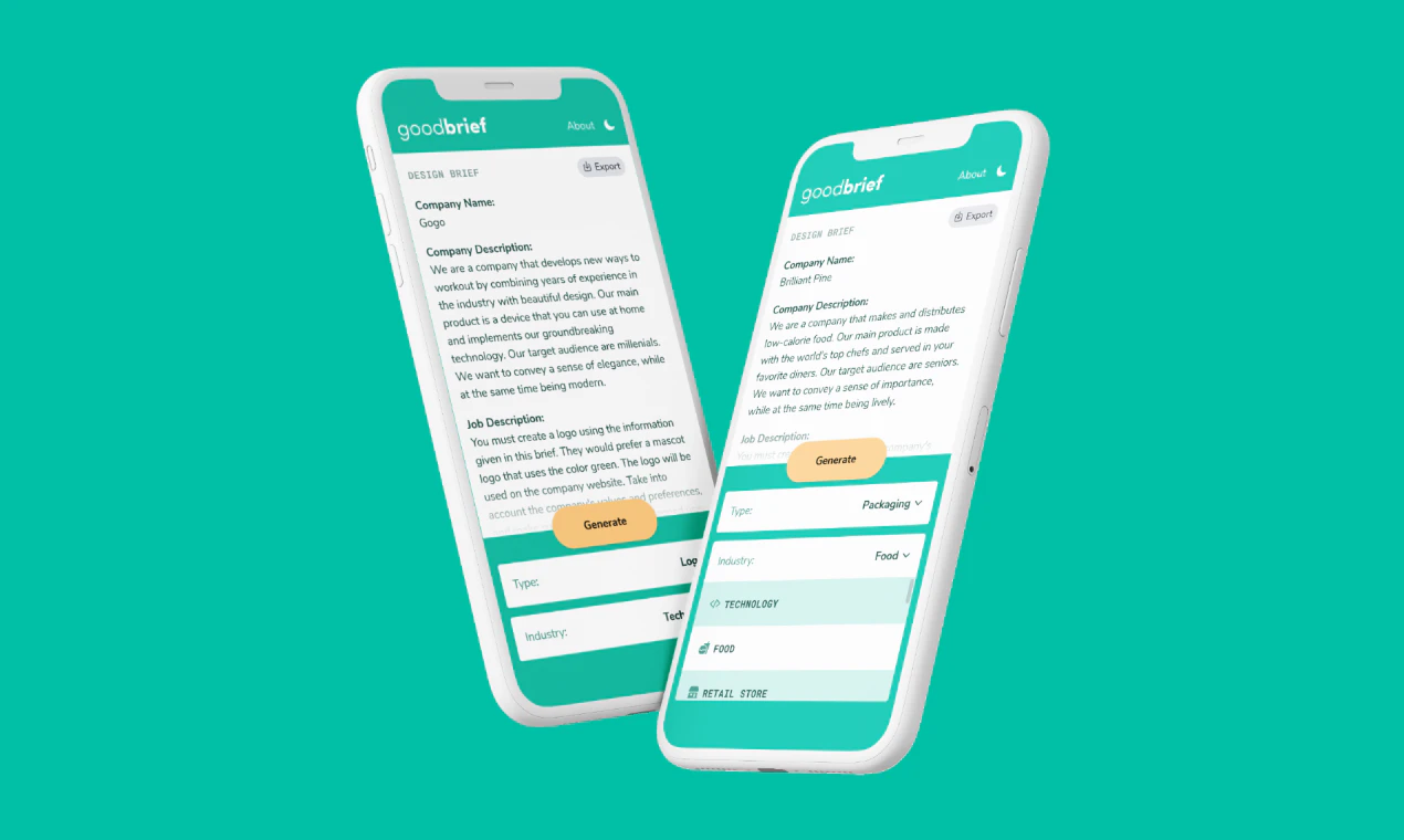 - Генератор дизайн-брифів: програма дає можливість створювати нескінченну кількість унікальних дизайн-брифів для різних категорій дизайну: розробки логотипів, UX-дизайну, UI-дизайну, графічного дизайну та вебу. Окрім того, Goodbrief також містить велику кількість різних ніш. Наприклад, створити логотип для люксового бренду одягу або розробити дизайн сайту для парку розваг у Кракові. Програма також надає розширену інформацію про специфікації.