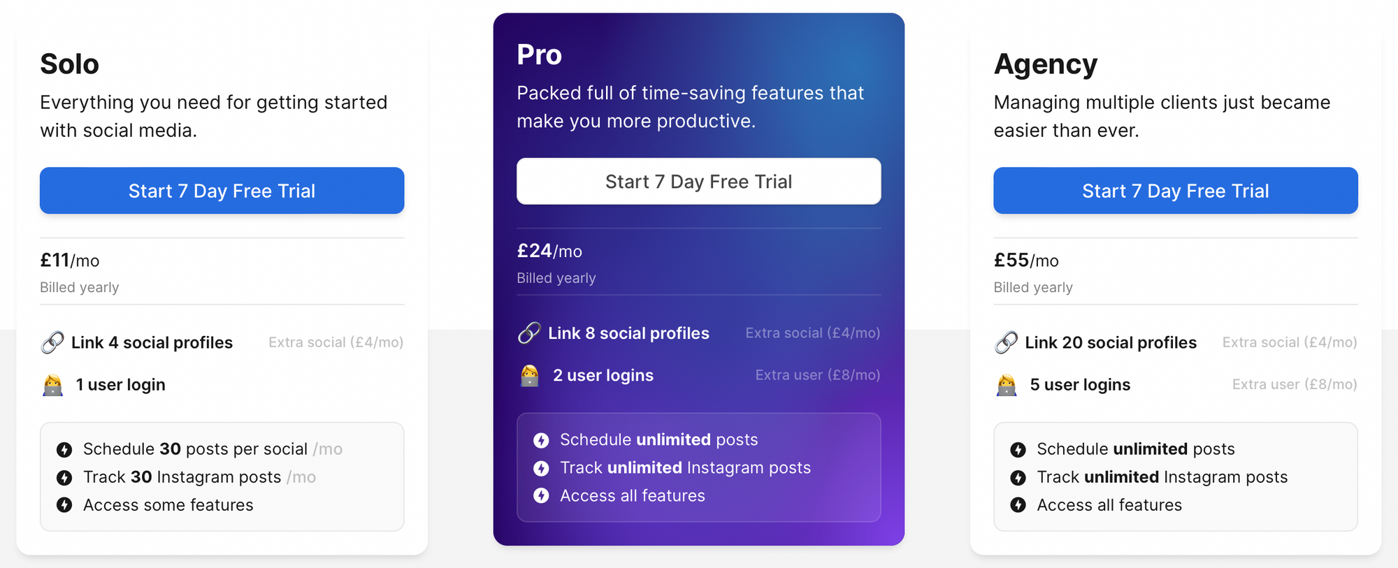 Професійний план вийде вам у £24 на місяць. За цю плату ви зможете додати до двох користувачів та підв’язати до 8 соціальних профілів зі всім актуальним функціоналом. Обмежень щодо планування та відстеження дописів немає. Додатковий профіль у соціальних мережах коштуватиме 4 фунти на місяць Вхід додаткового користувача коштує 8 фунтів стерлінгів на місяць.