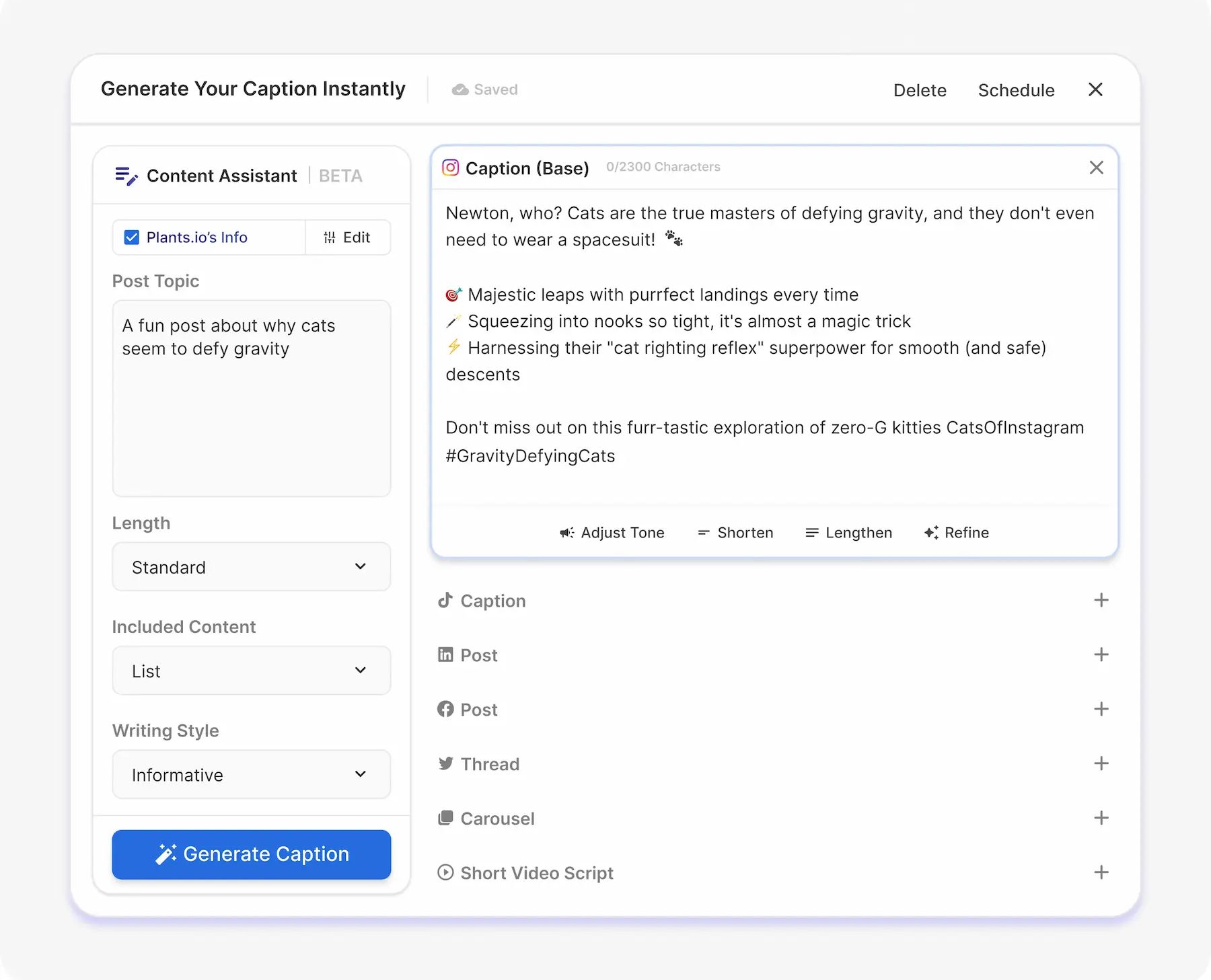 Flick справляється й зі складнощами організації вмісту та планування контенту за допомогою автоматизації на основі ШІ. Інструмент об’єднує всі ідеї, підписи, примітки на одній платформі, що дозволяє легко планувати публікації. Завдяки функції планування ви можете планувати візуальну, текстову складову допису, додавати хештеги, геолокацію, обирати оптимальний час для максимального охоплення та залучення, дозволяючи зосередитися на створенні якісного контенту, тоді як ШІ допоможе вам в організації.