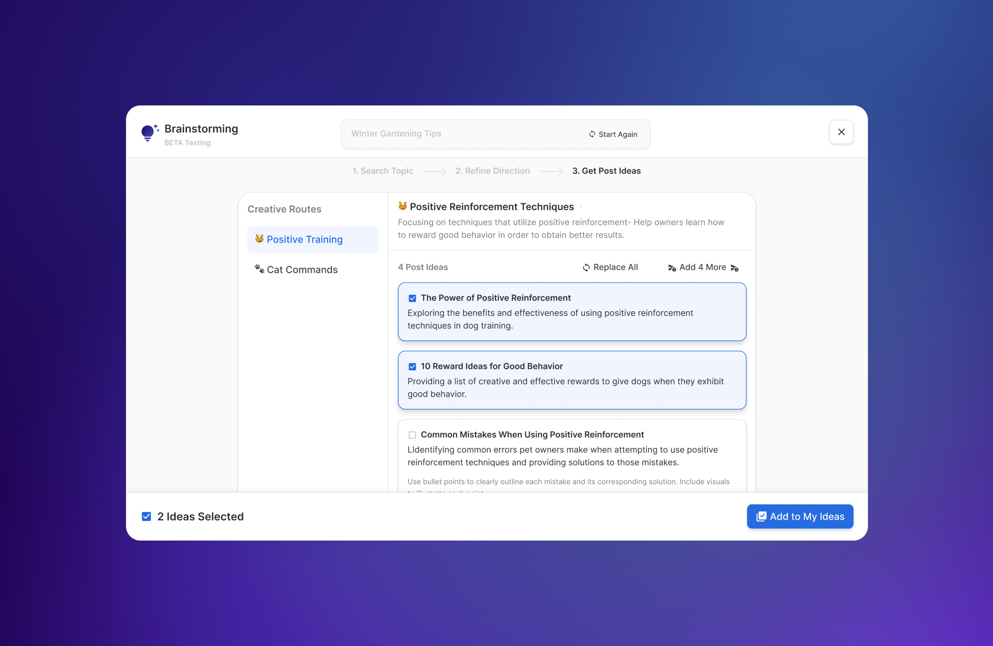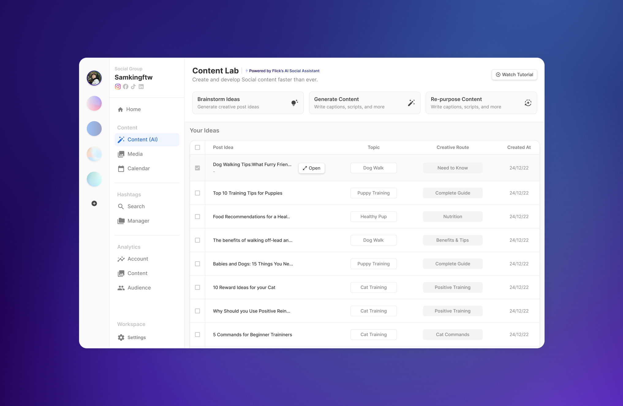 Функція допомагає генерувати ідеї для контенту, використовуючи вдосконалені алгоритми ШІ. Просто введіть тему, а штучний інтелект допоможе згенерувати безліч оригінальних ідей для вмісту, адаптованих до потреб цільової аудиторії. Таким чином, Flick дозволяє безпроблемно долати творчі кризи або розвивати вже існуючі ідеї, що резонують з вашою аудиторією.
