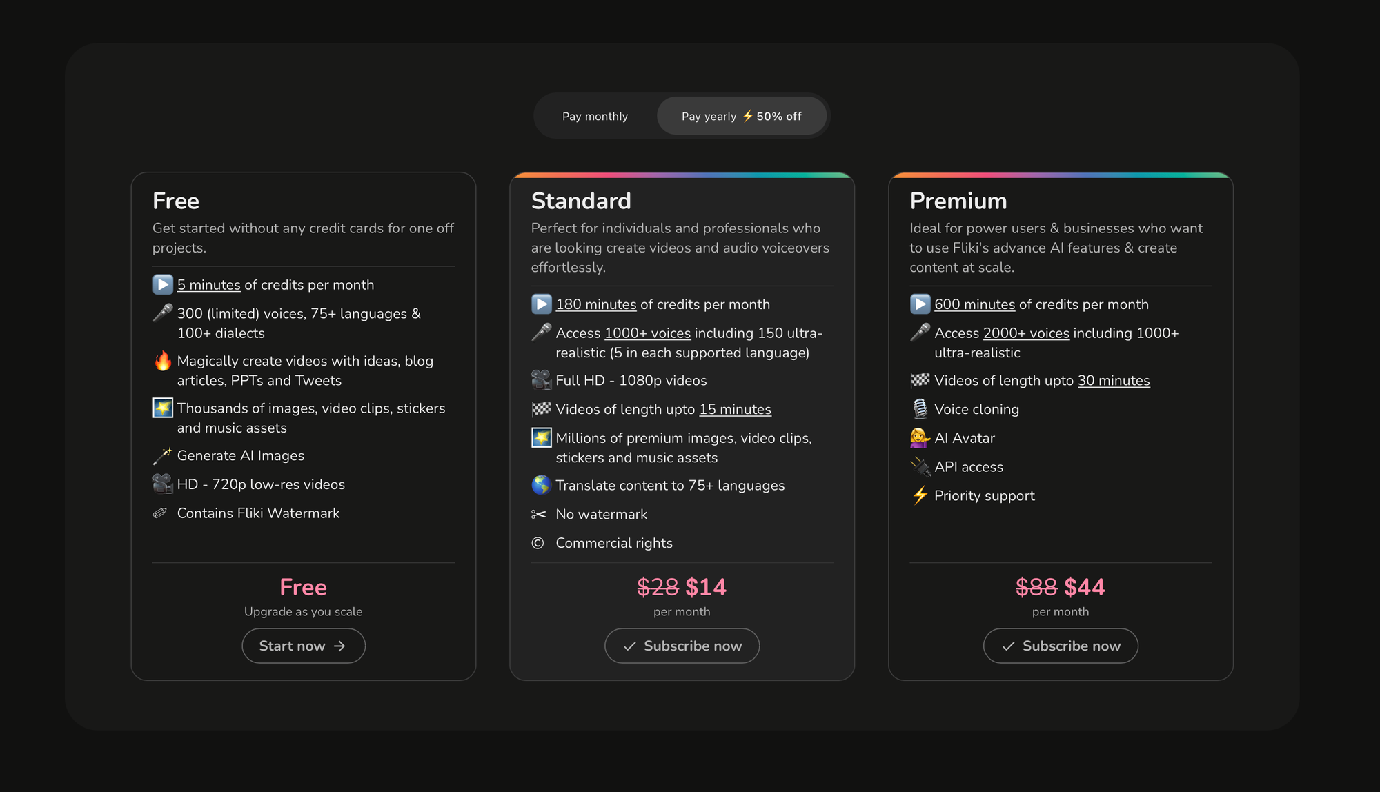 Flick має три тарифні плани: Free, Standart і Premium. Безкоштовний тарифний план дозволяє згенерувати декілька відео, загальна тривалість яких не перевищує 5 хвилин. Також безкоштовний план має обмежену кількість голосів (300 голосів). У виборі мови та діалектів платформа не обмежує. Користувачі також матимуть доступ до вбудованої медіа бібліотеки та матимуть доступ до ШІ генератора. Зауважте, що у безкоштовному плані всі відео будуть позначені водною маркою.