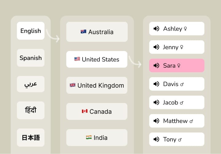 Далі виберіть голос для озвучення. Fliki має понад 2000 вбудованих людських голосів для перетворення тексту в мовлення більш ніж 75 мовами. Щоб зробити розповідь більш природною та цікавою можна додати та свій власний записаний голос, змінюючи такі елементи, як тон, стиль і емоції.