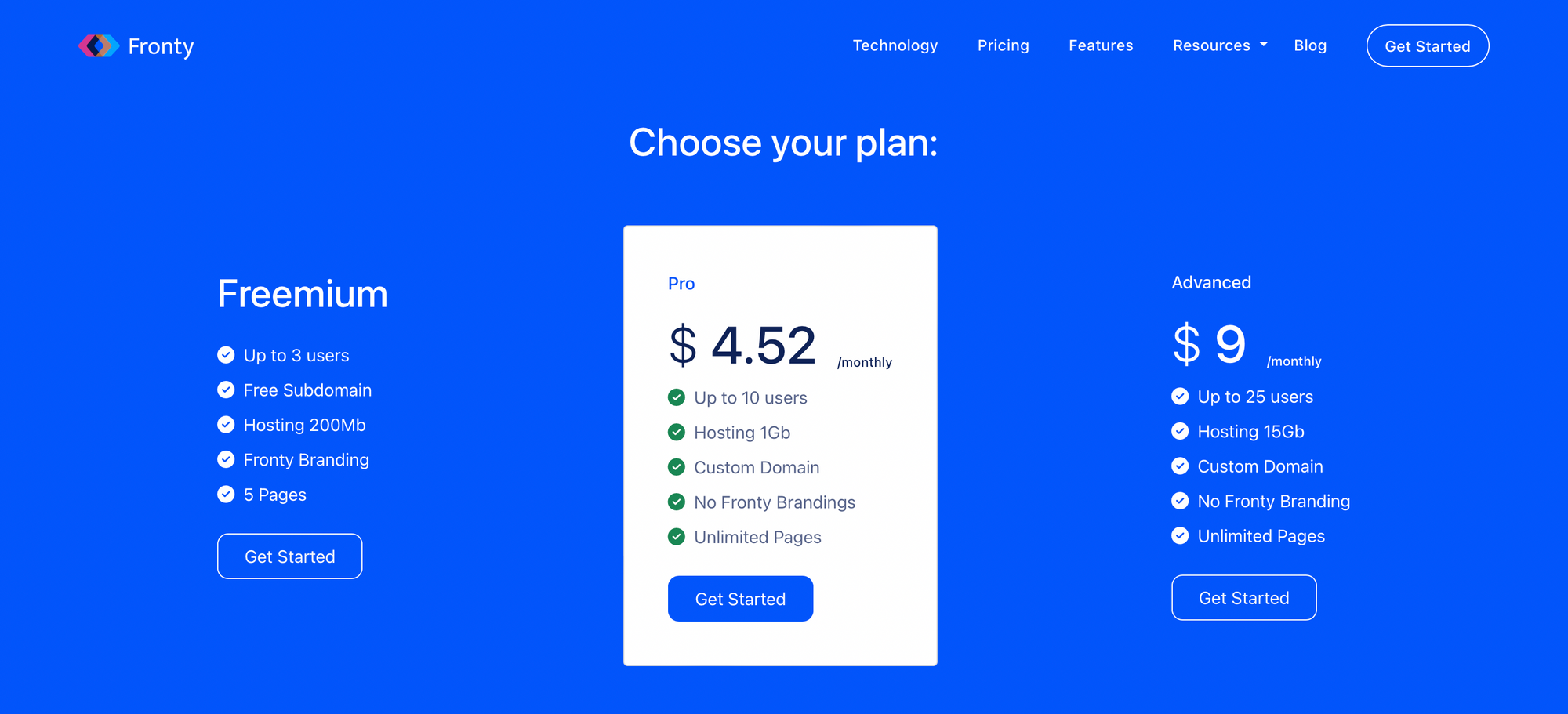 Безкоштовний план (Freemium). Цей план дозволяє випробувати основні функції Fronty безкоштовно. З його допомогою ви можете завантажити до 5 вебсторінок та скористатися AI-конвертером для отримання HTML і CSS коду. Є можливість додати безкоштовний субдомен, а також хостинг з обмеженнями у 200MB. Також ви зможете додати до 3 користувачів до свого облікового запису. Але зауважте, що у безкоштовному тарифному плані Fronty залишатиме свій брендинг на конвертації.