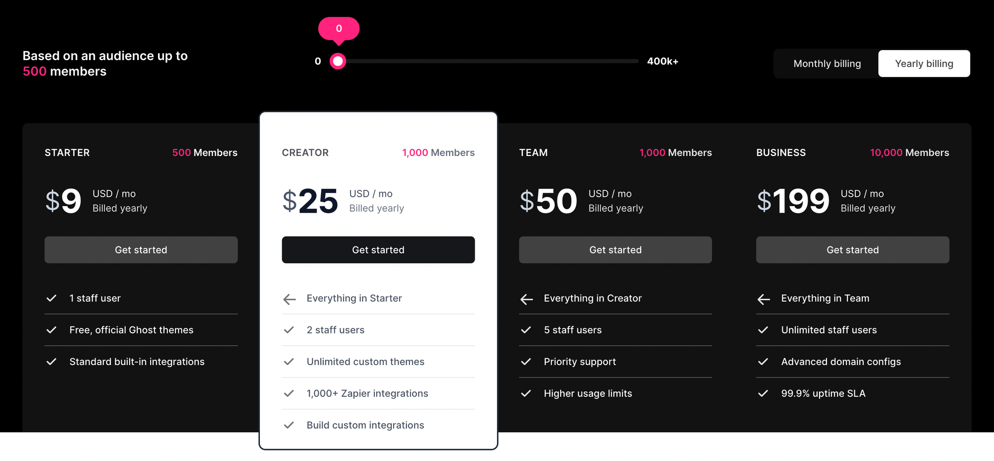 - Високі витрати на обслуговування великої спільноти: зі збільшенням кількості учасників вартість Ghost Pro також зростає. Досить легко може дійти до точки, коли хобі-блогеру буде незручно платити, але він не може або не хоче монетизувати свій блог.