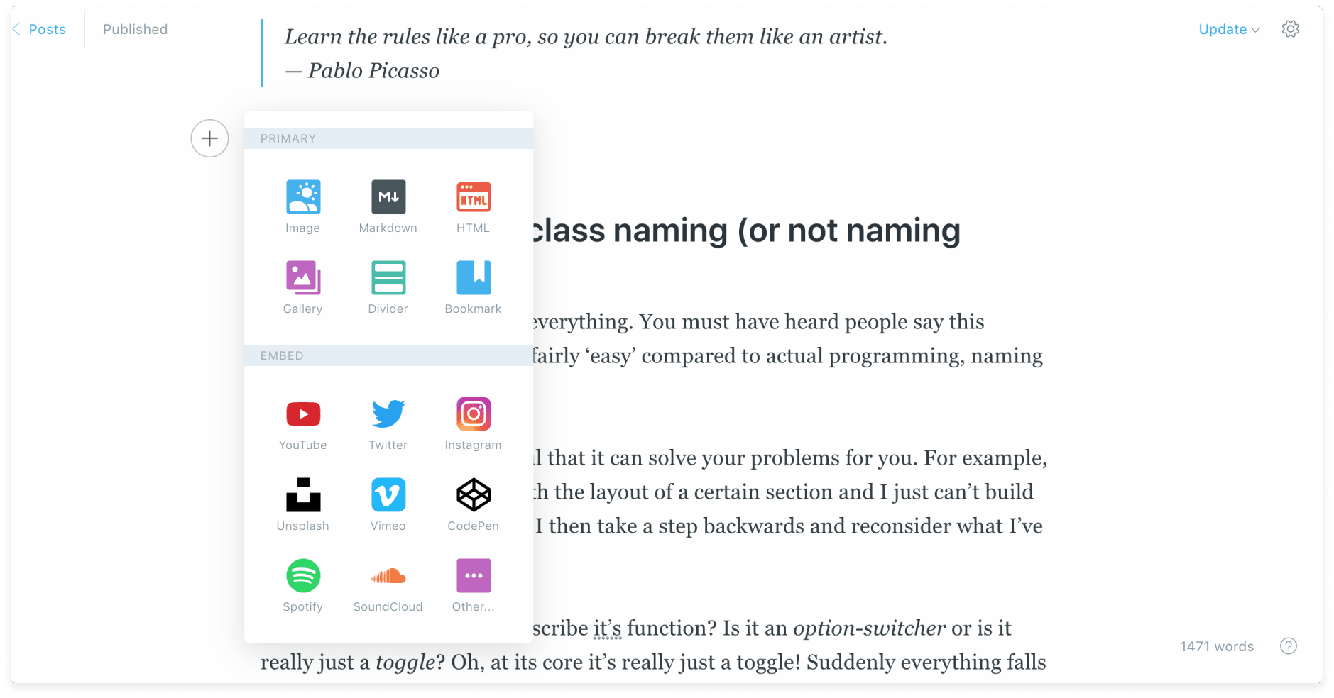 Редактор включає картки зображень, відео, Markdown, цитати, вбудовування з Twitter, SoundCloud, Instagram, YouTube тощо.