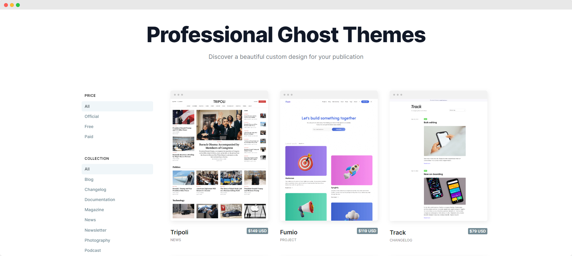 За допомогою Ghost Pro ви можете створити спеціальну URL-адресу для свого сайту, налаштувати власні шаблони дописів для певних типів дописів або сторінок і сортувати вміст свого блогу за допомогою тегів.