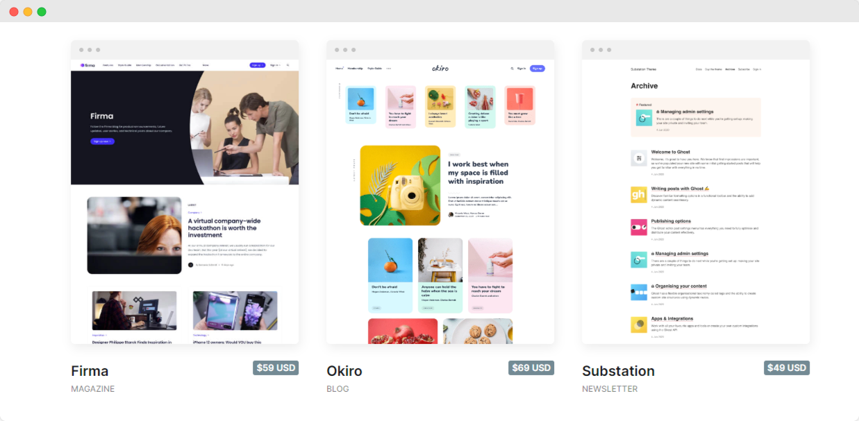 Теми вебсайту визначають зовнішній вигляд вашого сайту. Ghost за замовчуванням поставляється з журнальною темою під назвою Casper, але платформа також має тисячі адаптивних, красиво оформлених тем, які можна вибрати. У них є як безкоштовні, так і платні варіанти. Вартість яких стартує від 19 до 149 доларів.