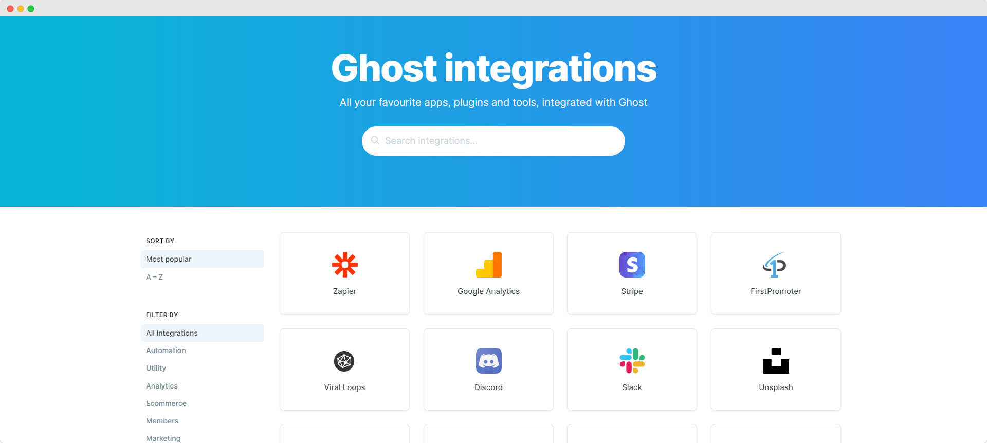 Ghost підтримує безліч інтеграцій, зокрема Slack, Google Ads Manager, Gmail тощо. Деякі є вбудованими, а інші можна налаштувати вручну, якщо потрібно. За допомогою Zapier Ghost може безпосередньо інтегруватися з понад 5000 програмами та службами.