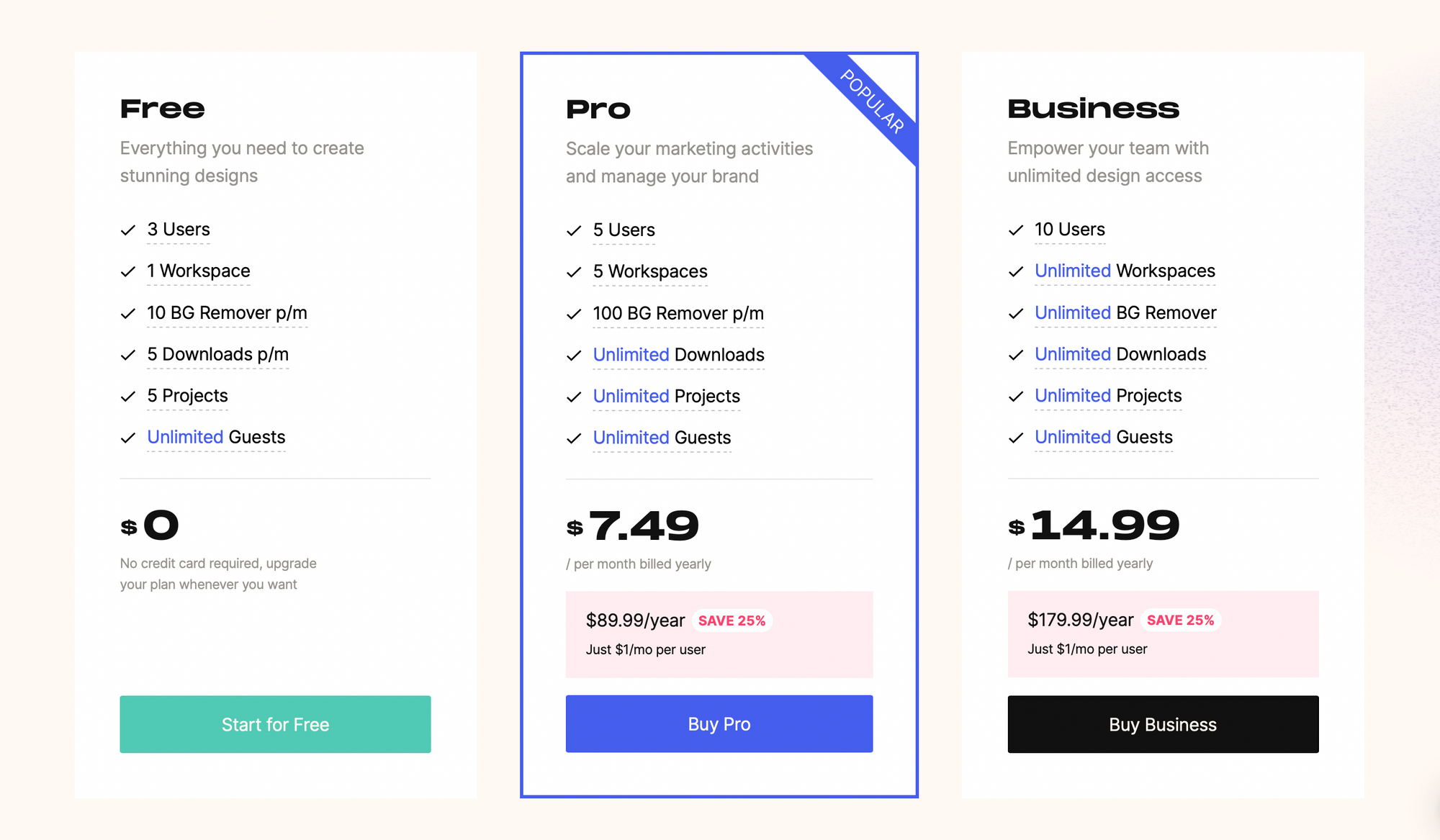 Окрім платних тарифних планів, Glorify також має безкоштовну версію додатка. Безкоштовна версія має багато переваг, зокрема 5 завантажень на місяць, які можуть використовувати до 3 користувачів і необмежена кількість гостей. Хоча інструмент пропонує лише один робочий простір, Glorify компенсує це 5 проєктами, 10 видаленнями фону, а також 10 стоковими матеріалами на місяць. Інші два плани: план Pro та Business. Ці плани коштуватимуть користувачам 7,49 та 14,99 долара США на місяць відповідно. Плани включають усі функції безкоштовної версії, а також додаткові функції. Як, наприклад, отримати доступ до 5 робочих просторів у плані Pro та необмеженого робочого простору в плані Business.