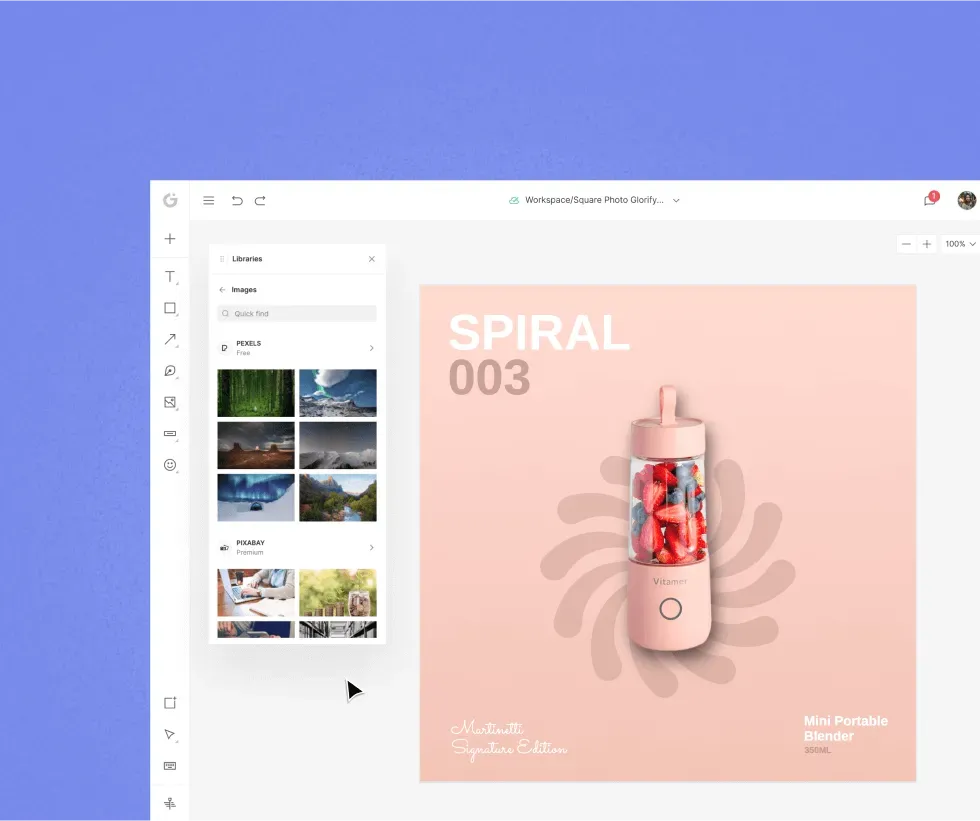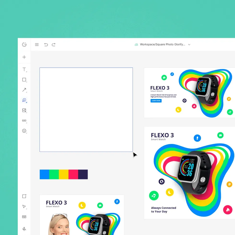 Glorify — це універсальне програмне забезпечення для проєктування та розробки графічних матеріалів, яке дозволяє створювати банери, дописи для соціальних мереж, логотипи, типографіку та будь-яку іншу графіку. За допомогою інструменту користувачі можуть створювати висококонверсійні оголошення, якісну інфографіку, а також презентації та макети. Glorify — одна з найкращих програм не лише для дизайнерів, які хочуть пришвидшити процес генерації графіки, але й для підприємців без навичок дизайну або бюджету.
